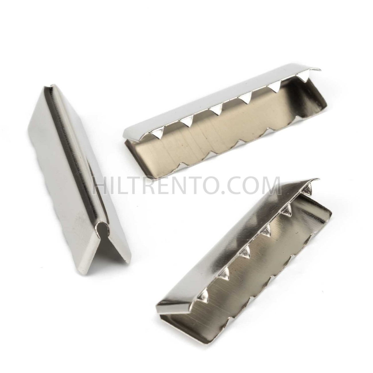 Terminal tipo pinza con dientes para colocar en el extremo de cintas, correas o cinturones. Se aprieta y se dobla contra la cinta de forma que sus dientes quedan incrustados y no se mueven. Se le puede dar un refuerzo extra añadiendo unas gotas de adhesivo.