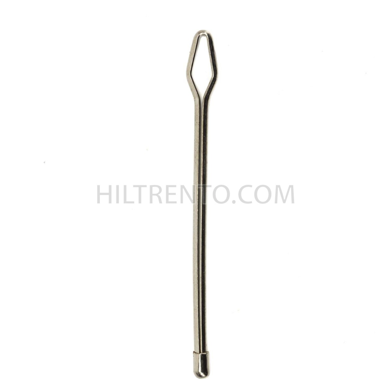Pasacintas de acero inoxidable. Esta herramientas se utiliza para pasar cintas, elásticos o lazos a través de dobladillos, cintura de bañadores, pantalones, etc. El cordón o la cinta se inserta en la herramienta y su cuerpo rígido metálico permite ir deslizándola fácilmente por el interior de la prenda hasta sacarla por el otro lado. Uso cómodo y seguro sin dañar el tejido.