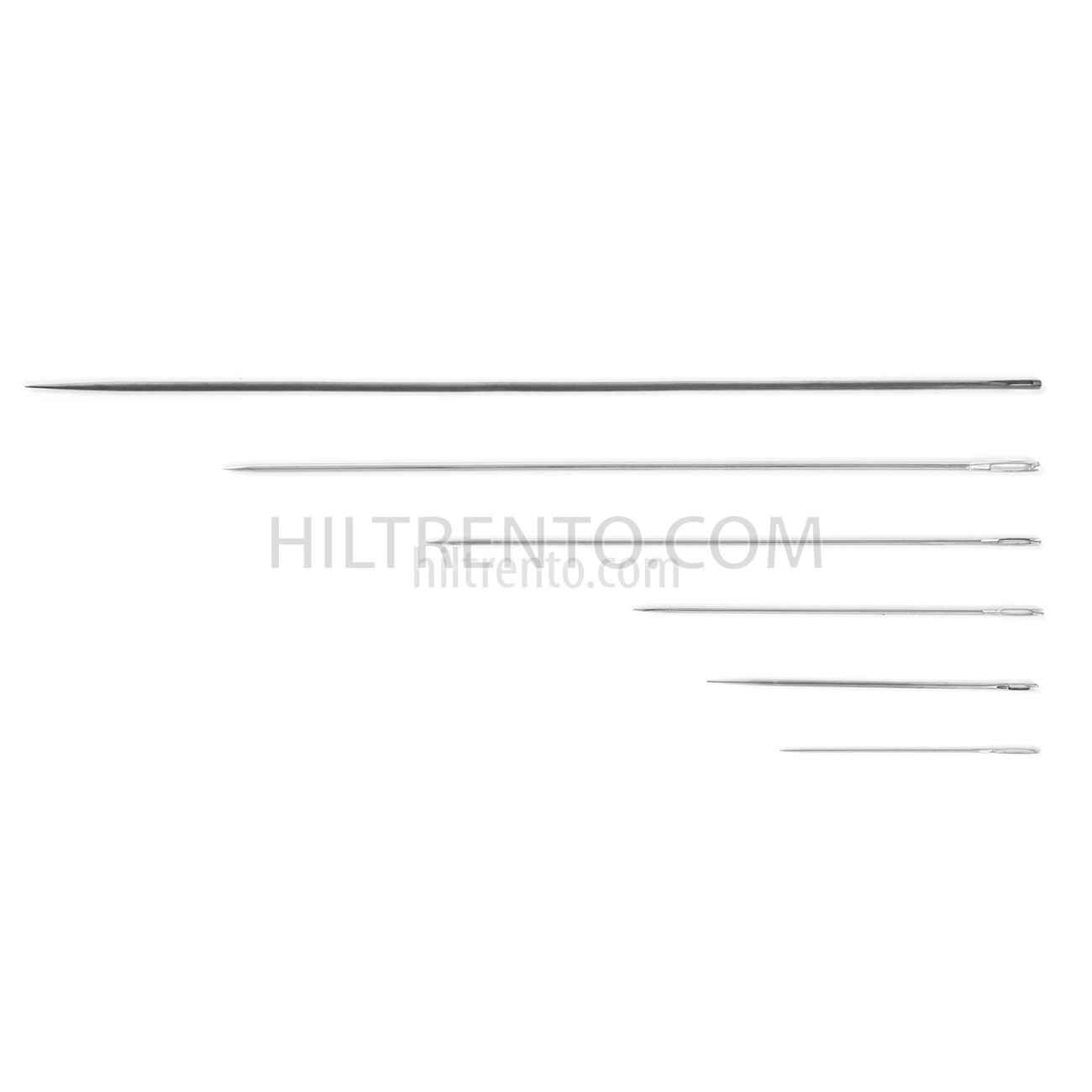Agujas rectas con ojo en un lado y punta afilada en el otro. Fabricadas en acero de alta calidad, para coser cuero, piel, materiales sintéticos, tejidos, etc. Se utilizan en artesanía, marroquinería, tapicería, y una amplia gama de aplicaciones.
