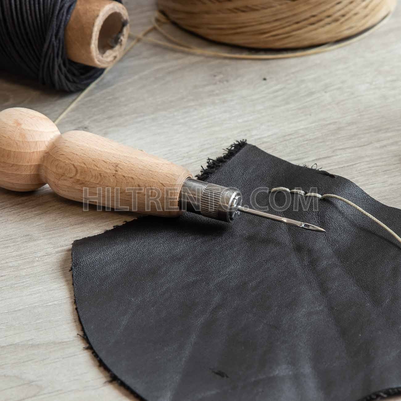 Aguja con ojal y mango de madera, para coser a mano. Acabado en forma de espada para un corte del cuero limpio y preciso. No es necesario perforar antes, ya que la aguja tiene una punta cortante. Se usa para coser marroquinería, bolsos, zapatos, y cuero en general. Aguja bañada al cromo, de la más alta calidad. Pensada para hacer miles de pasadas sin perder el filo.