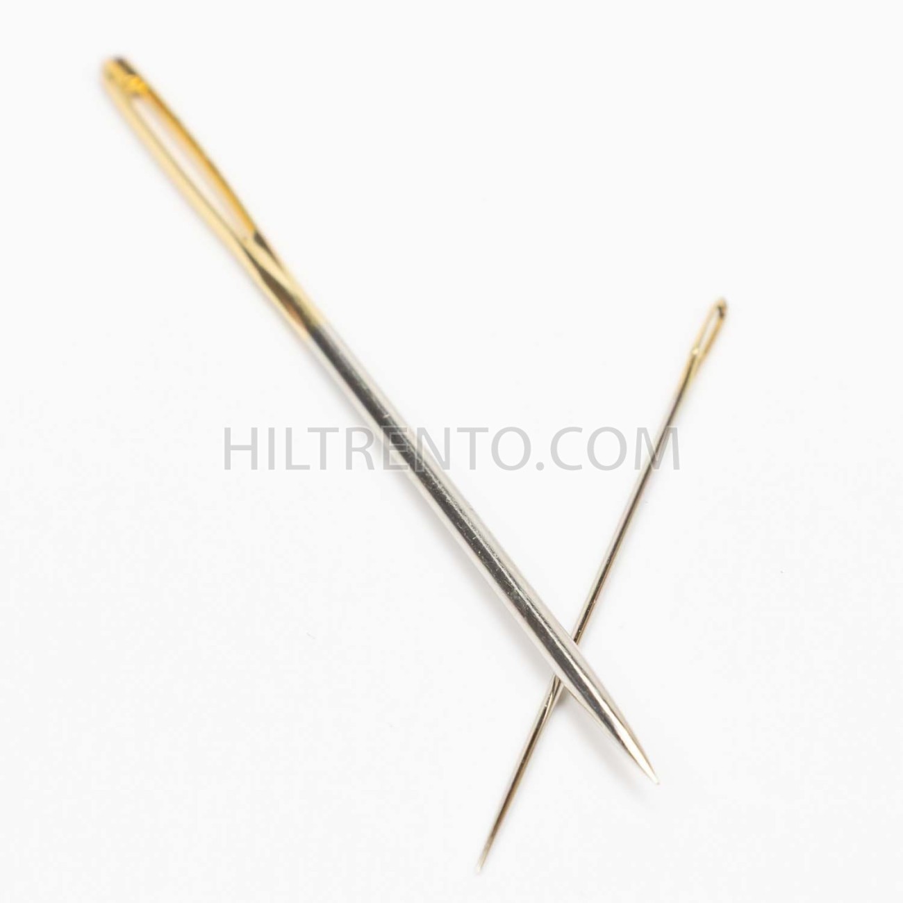 Agujas tapiceras de ojo dorado con punta afilada, también llamadas laneras. Especiales para tapicería, telas, tejidos y confección.