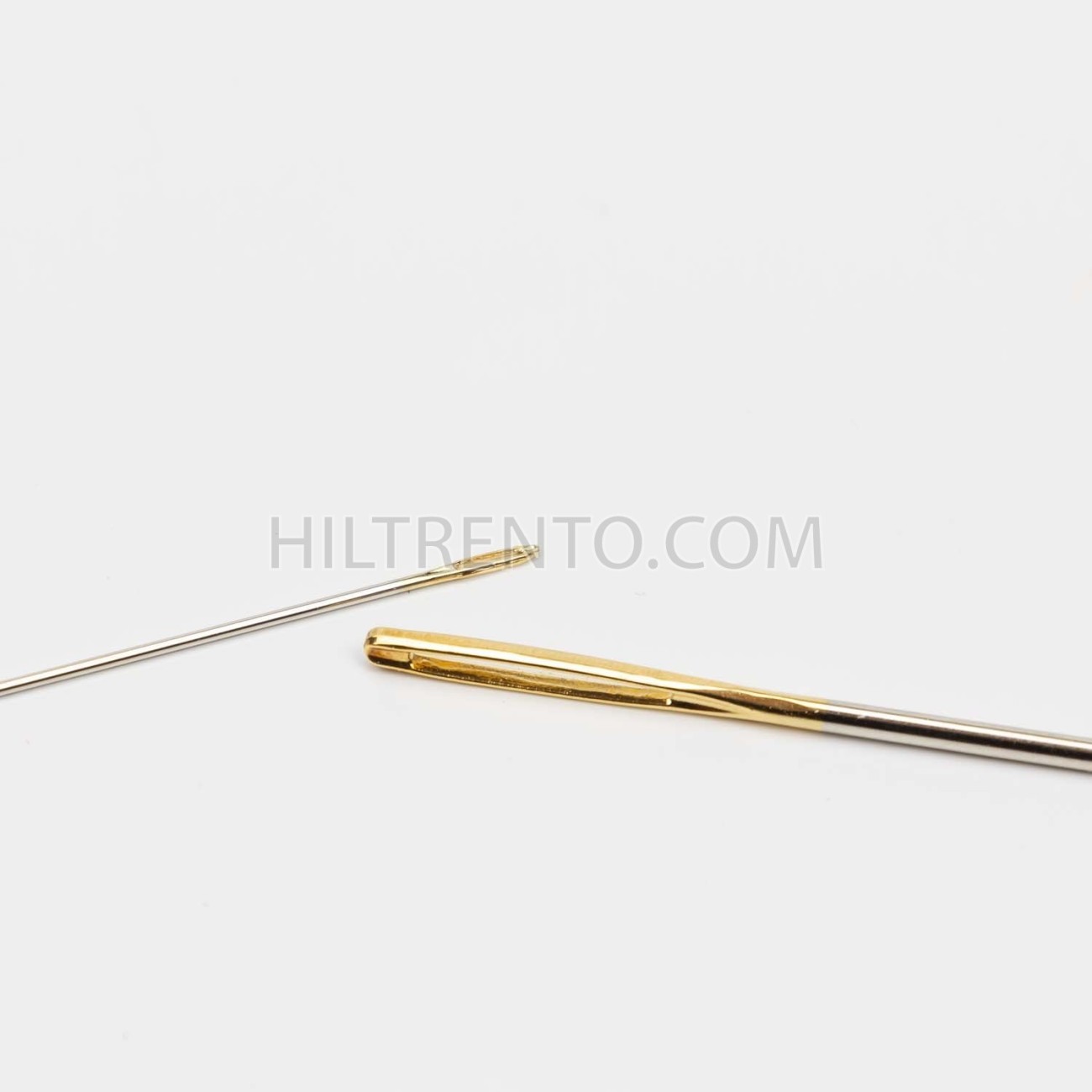 Agujas tapiceras de ojo dorado con punta afilada, también llamadas laneras. Especiales para tapicería, telas, tejidos y confección.