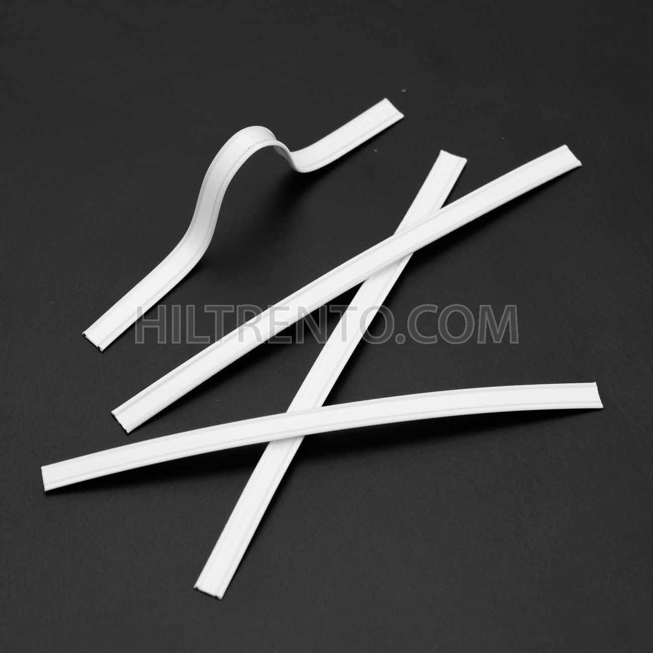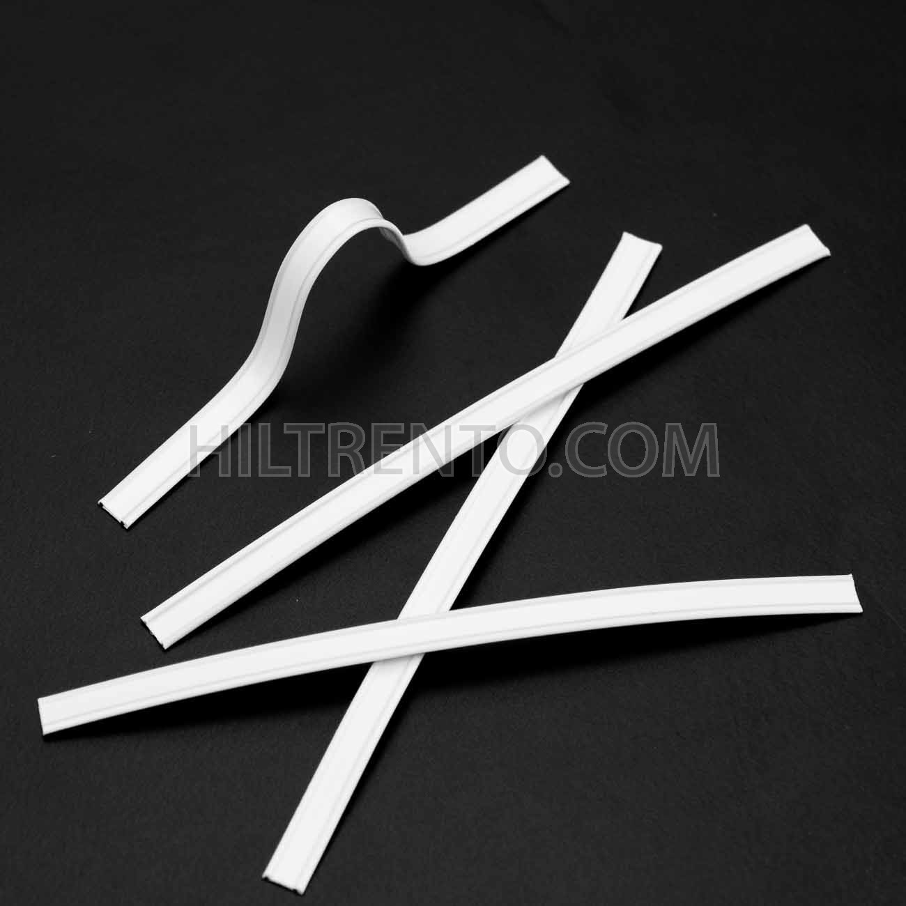 Alambre doble clipband plastificado, cortado en tiras, formado por dos alambres en su interior y una funda plástica. Los alambres que recorren la tira, están pegados a los extremos de la cinta. Se utiliza tanto para fabricar mascarillas FFP2 en máquinas automáticas de soldadura por ultrasonido, como para mascarillas de tela cosidas.