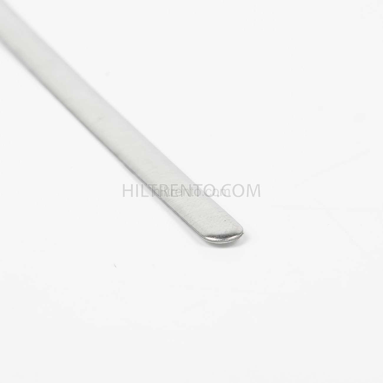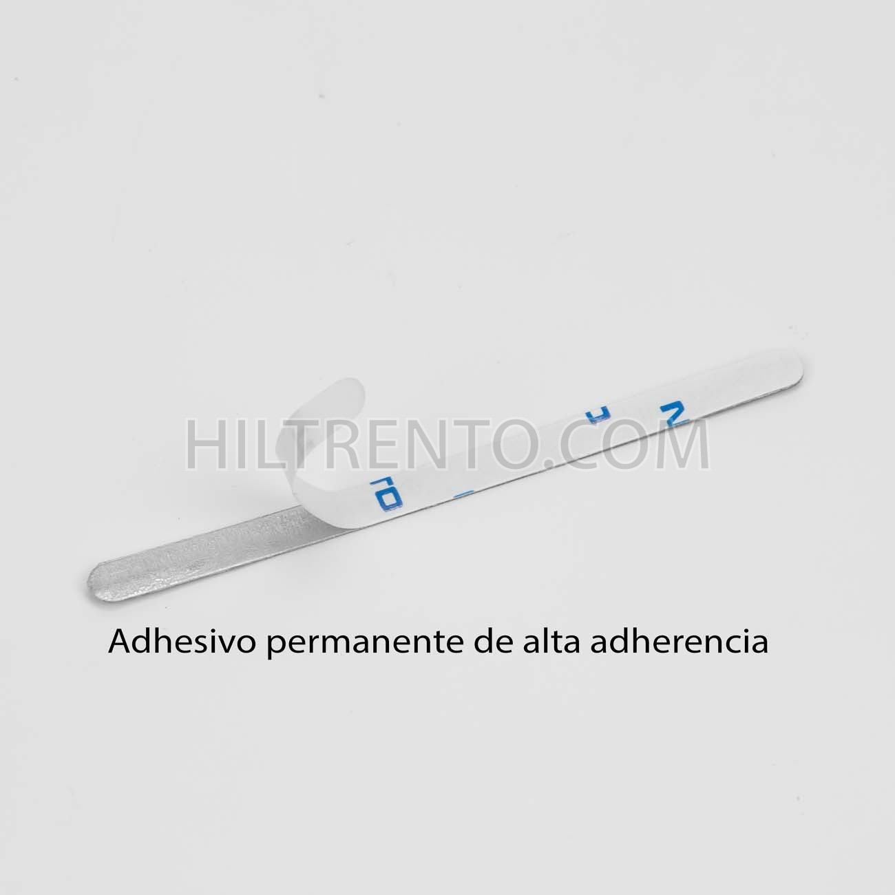 Tiras adhesivas de acero con forma redondeada abombada, con adhesivo de alta adherencia, para pegar en mascarillas y dar la forma nasal. Están fabricadas en acero, altamente resistente al doblado continuado, a diferencia del aluminio, no se rompen tras varios doblados. Forma ligeramente abombada que aporta resistencia. Se puede pegar tanto al TNT como al algodón o poliéster. Solamente ha de despegar el protector del adhesivo y adherirlo.