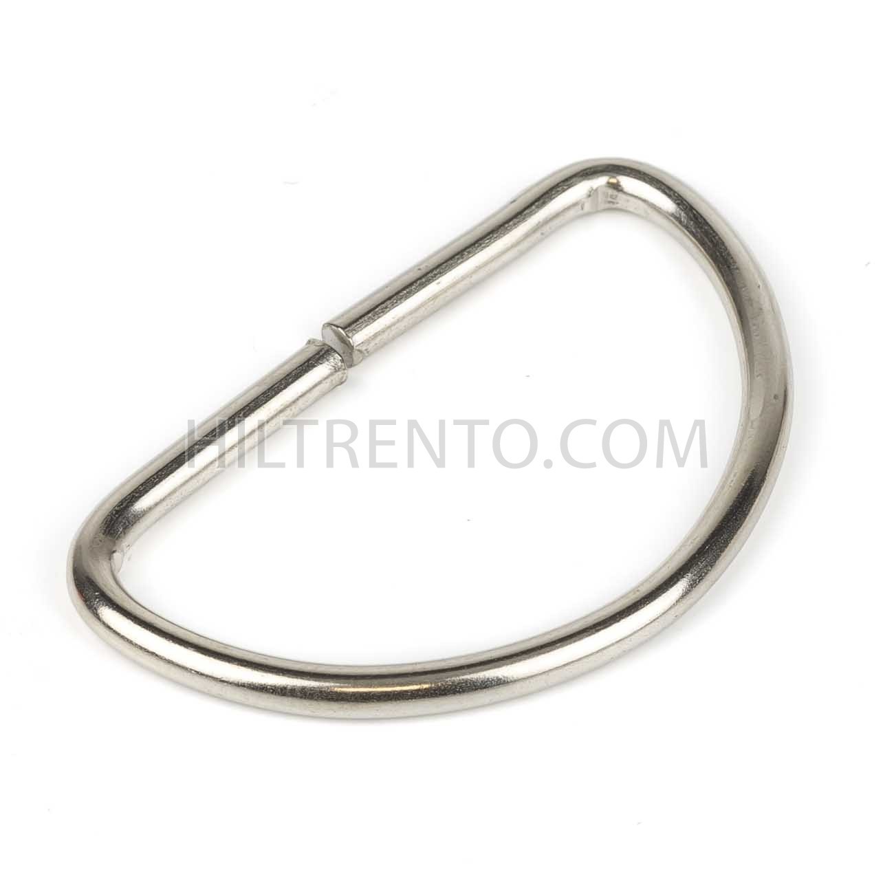 Anilla metálica en forma de media luna o D, con un lado plano. Estas semianillas se utilizan para correas de bolsos, collares para animales, bolsos de mano, llaveros y artículos de piel, lanyards, etc.