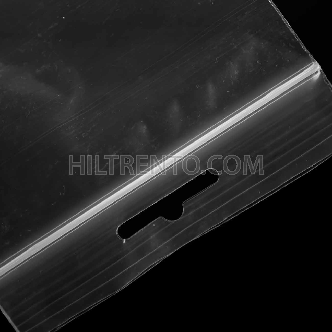 Bolsa transparente de polietileno con taladro redondo para colgar de las estanterías. Apta para el uso alimentario