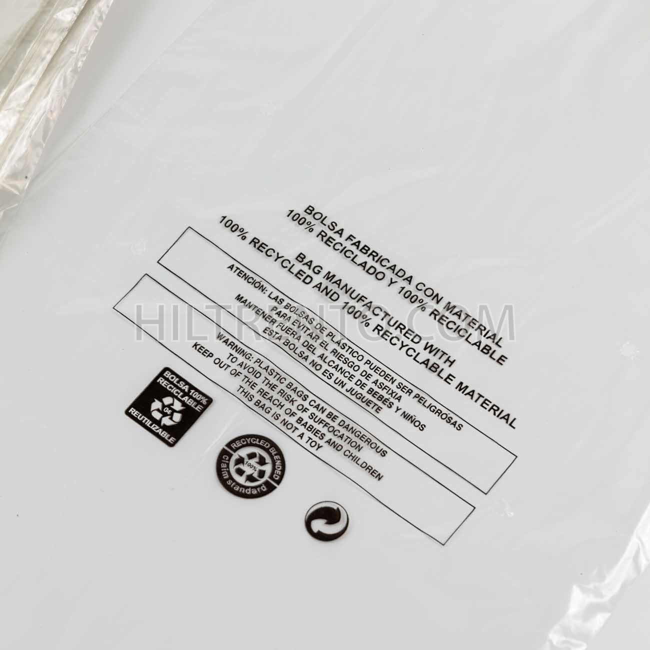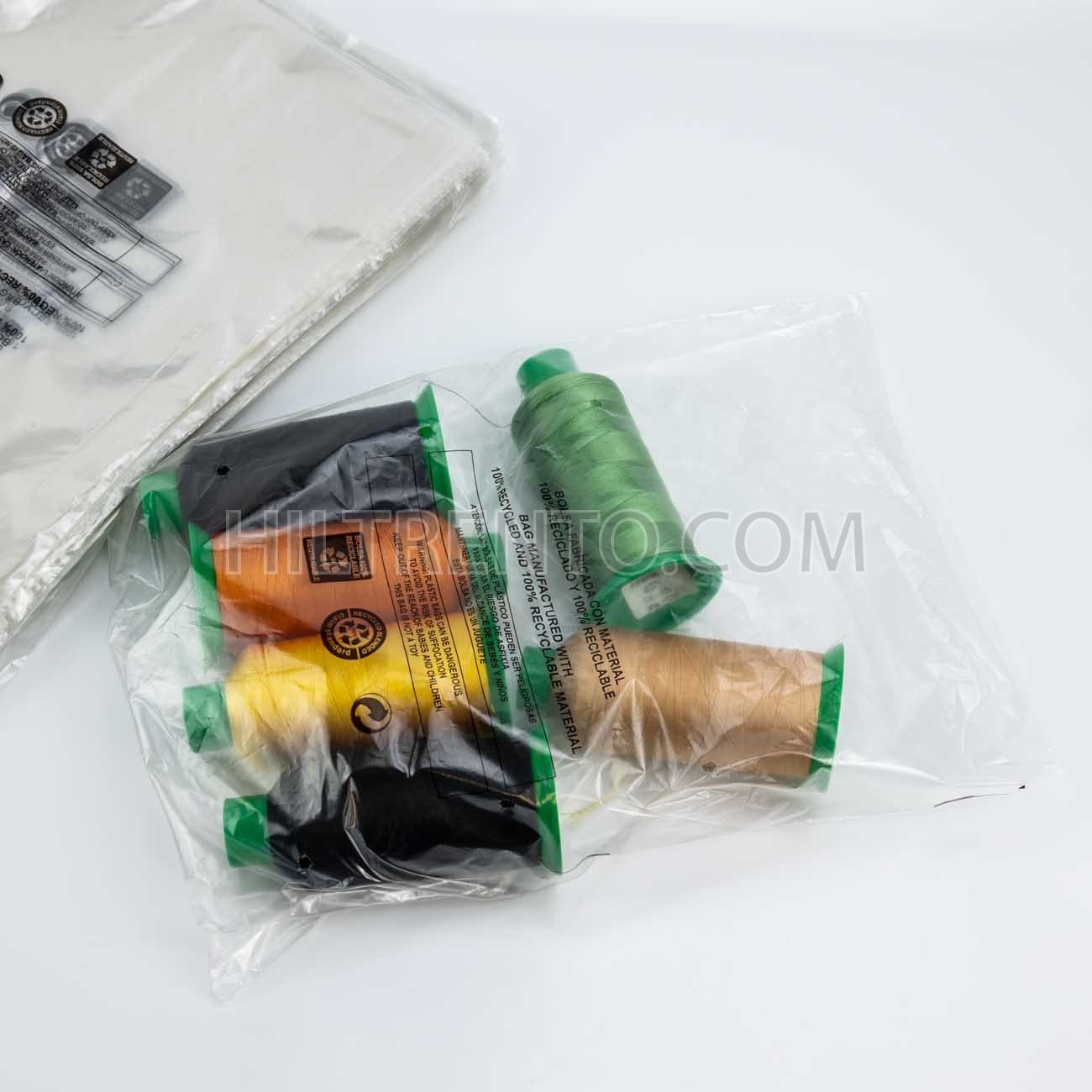 Bolsas de plástico fabricadas a partir de plástico 100% reciclado, perforadas con unos agujeros para facilitar el flujo de aire. Se utilizan, entre otras cosas, para envolver zapatos en la industria del calzado. La bolsa lleva entre 6 a 10 pequeños agujeros de 5 mm de diámetro.