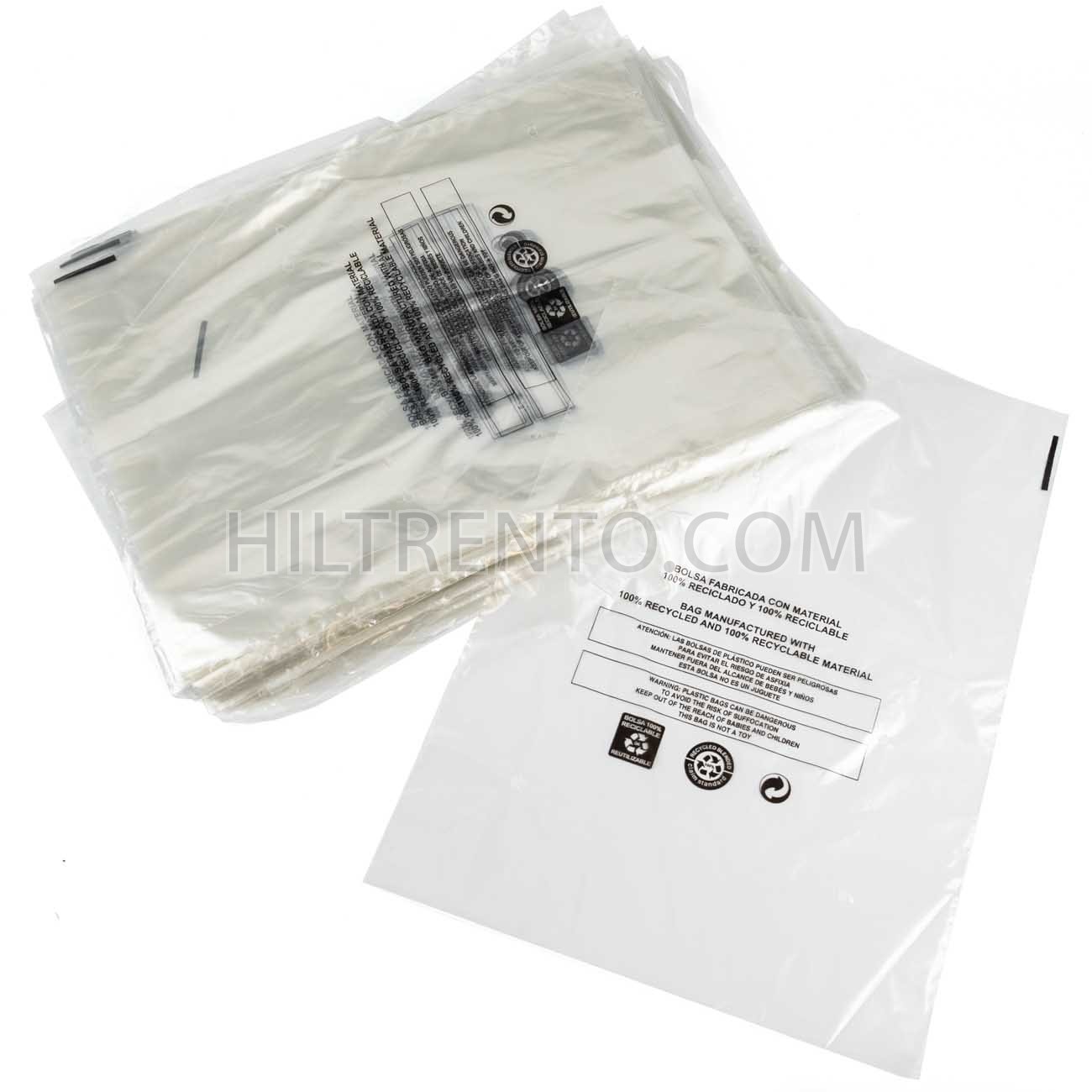Bolsas de plástico fabricadas a partir de plástico 100% reciclado, perforadas con unos agujeros para facilitar el flujo de aire. Se utilizan, entre otras cosas, para envolver zapatos en la industria del calzado. La bolsa lleva entre 6 a 10 pequeños agujeros de 5 mm de diámetro.