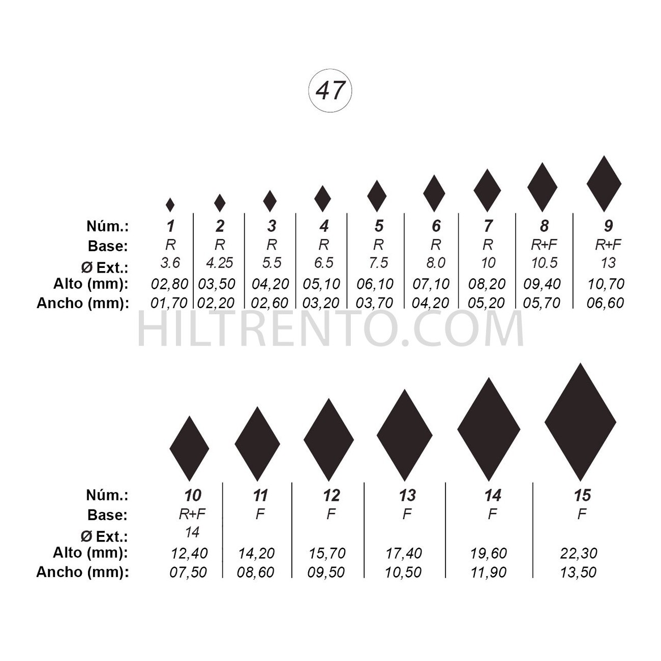 Agujas con forma de rombo para realizar cortes y perforaciones a piel, cartón, plástico, etc., tanto a mano como a máquina. Las aguas de picar, también llamadas puntas, troqueles o boquillas para perforar cuero, están fabricadas en España con acero templado. Mediante el tratamiento de temple se consigue una dureza óptima del metal para que la boquilla no quede ni muy dura ni muy blanda, evitando así la rotura.