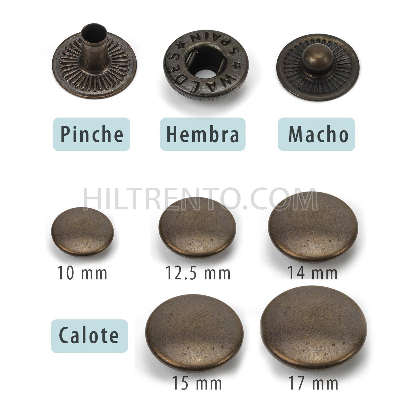 Broche o botón de presión metálico, de tensión suave, adecuado para marroquinería, estuches, monederos, bolsos, fundas, etc. También para confección en camisas, gabardinas, chaquetas, anoraks, pantalones, etc. Fabricados en latón, un material inoxidable a prueba de ambientes húmedos y salinos. Resistentes a la intemperie y adecuados también para el sector náutico. Calidad industrial, pensados para aguantar el desgaste y uso continuado durante miles de veces.