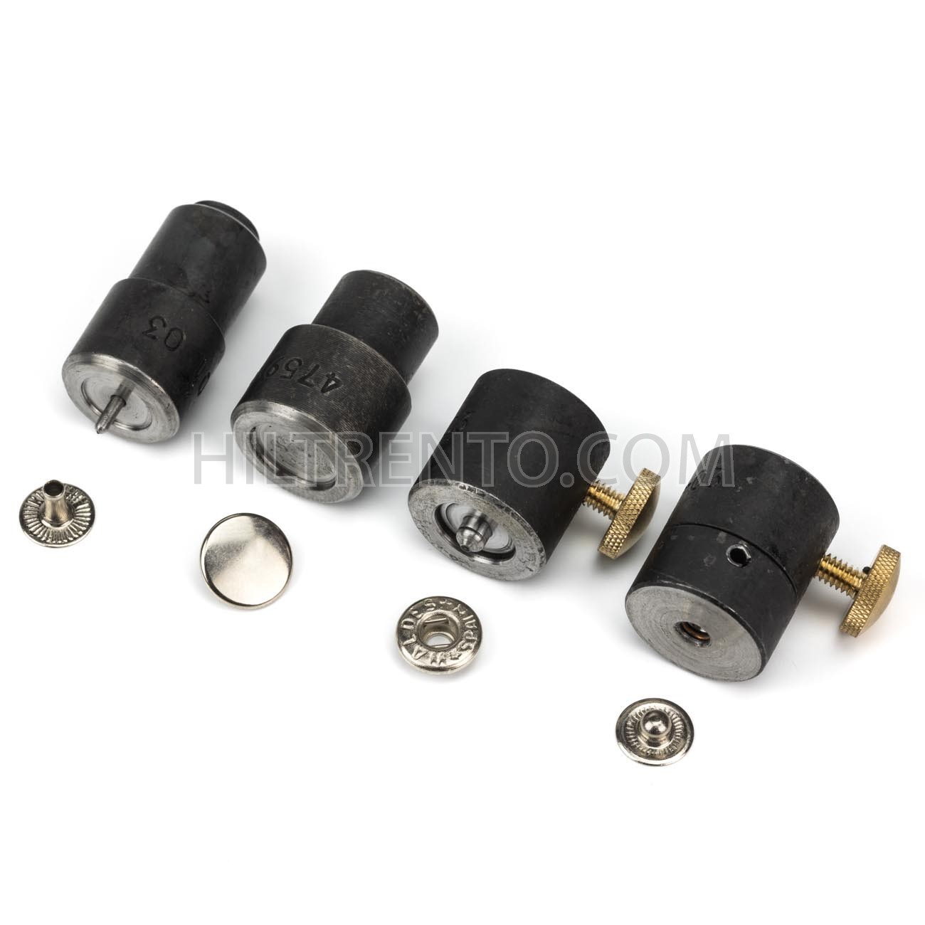 Troqueles , también llamados boquillas, para colocar el broche olimpia 200 de la marca waldes. Consta de 4 piezas. El troquel que coloca el pinche, la hembra y el macho son comunes, ya que estas 3 piezas son siempre las mismas independientemente del tamaño del calote, El troquel que coloca el calote está disponible en varios tamaños y depende del tamaño del calote que vayas a colocar, tendrás que comprar su correspondiente troquel
