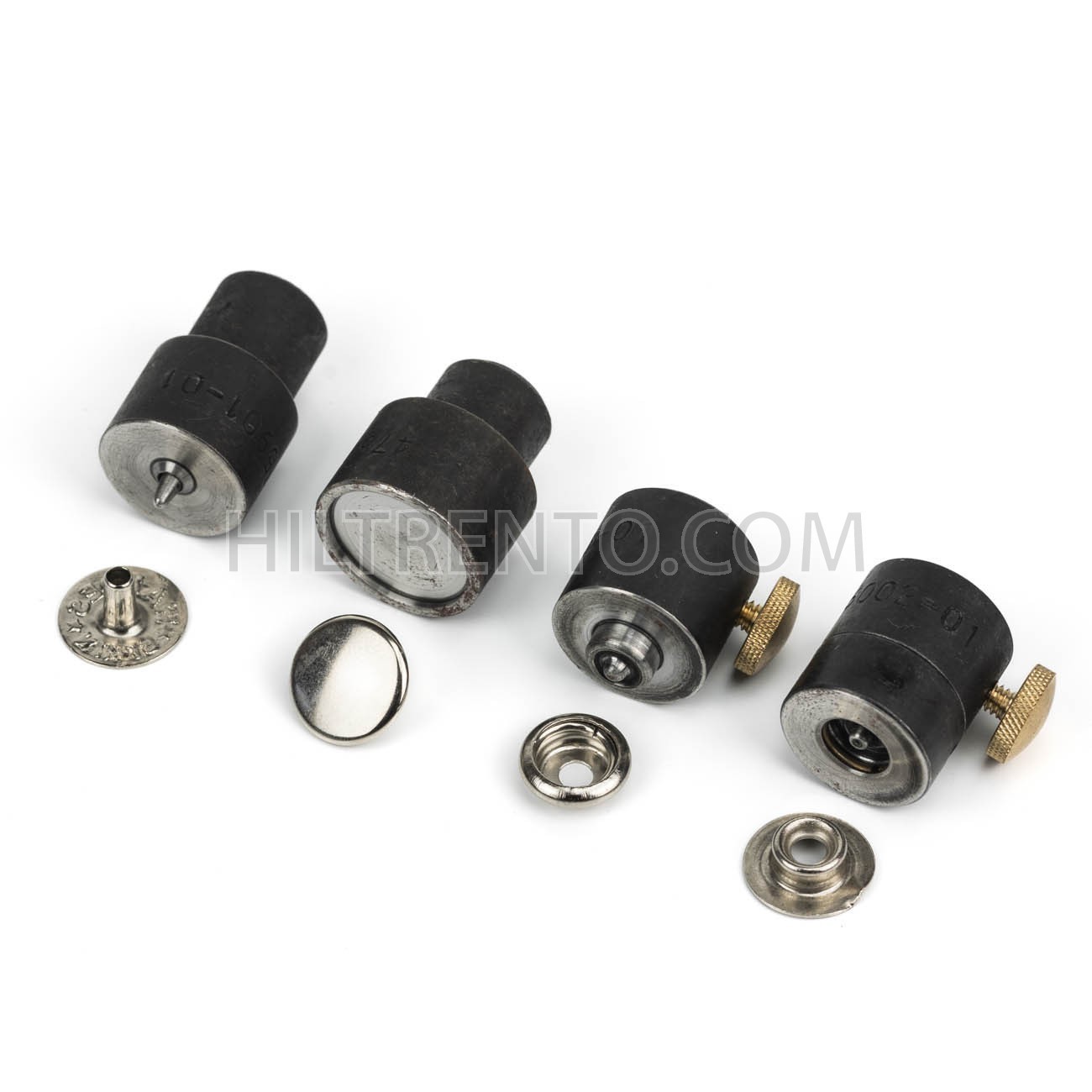 Troqueles, también llamados boquillas, para colocar el broche olimpia 8020 de la marca waldes. Consta de 4 piezas. El troquel que coloca el pinche, la hembra y el macho son comunes, ya que estas 3 piezas son siempre las mismas independientemente del tamaño del calote, El troquel que coloca el calote está disponible en varios tamaños y depende del tamaño del calote que vayas a colocar, tendrás que comprar su correspondiente troquel