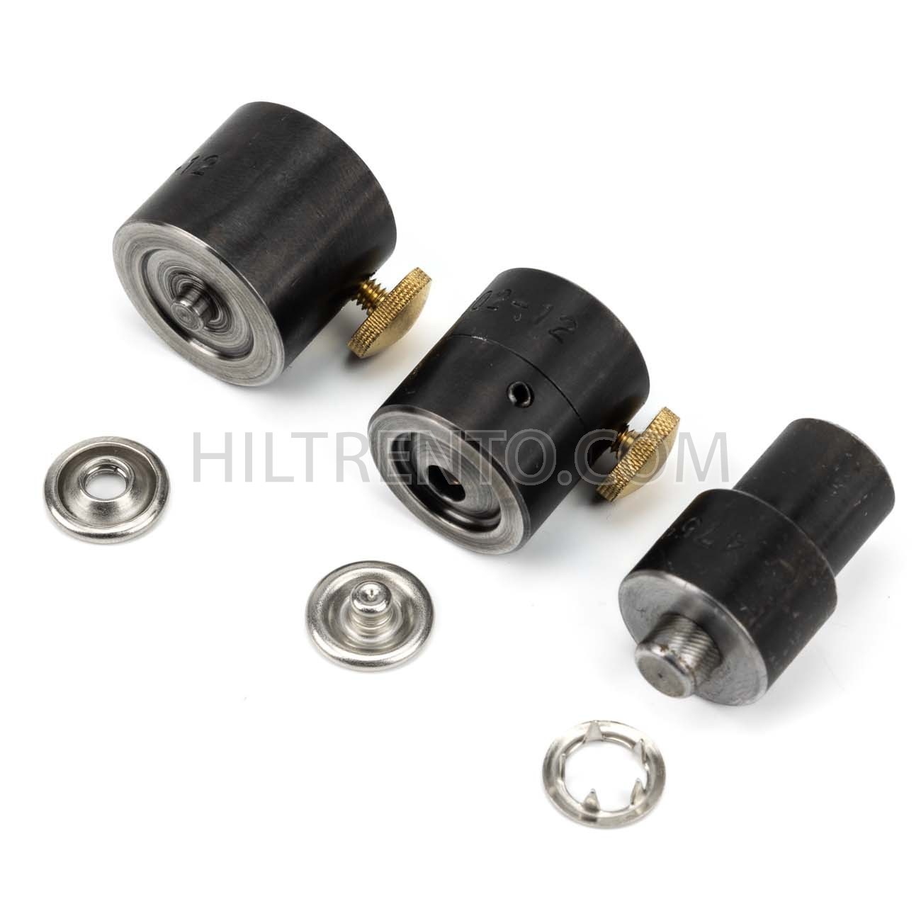 Troqueles , también llamados boquillas, para colocar el snap rival 1500 de la marca waldes, también compatible con otras marcas del mercado. Consta de 3 piezas. El troquel que coloca la hembra, el macho y la arandela. En este tipo de broche se coloca macho + arandela por un lado y hembra + arandela por otro, por lo que la arandela es común a las otros dos piezas. Para colocar un broche completo se necesitan dos arandelas, un macho y una hembra.