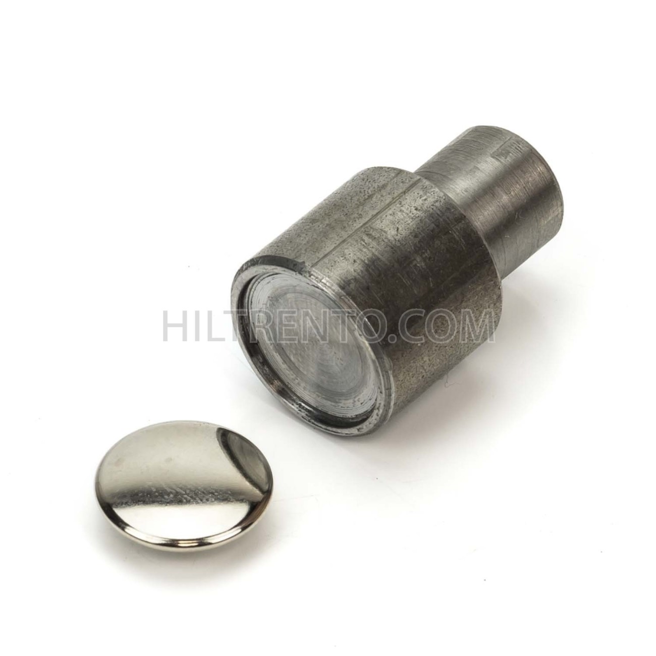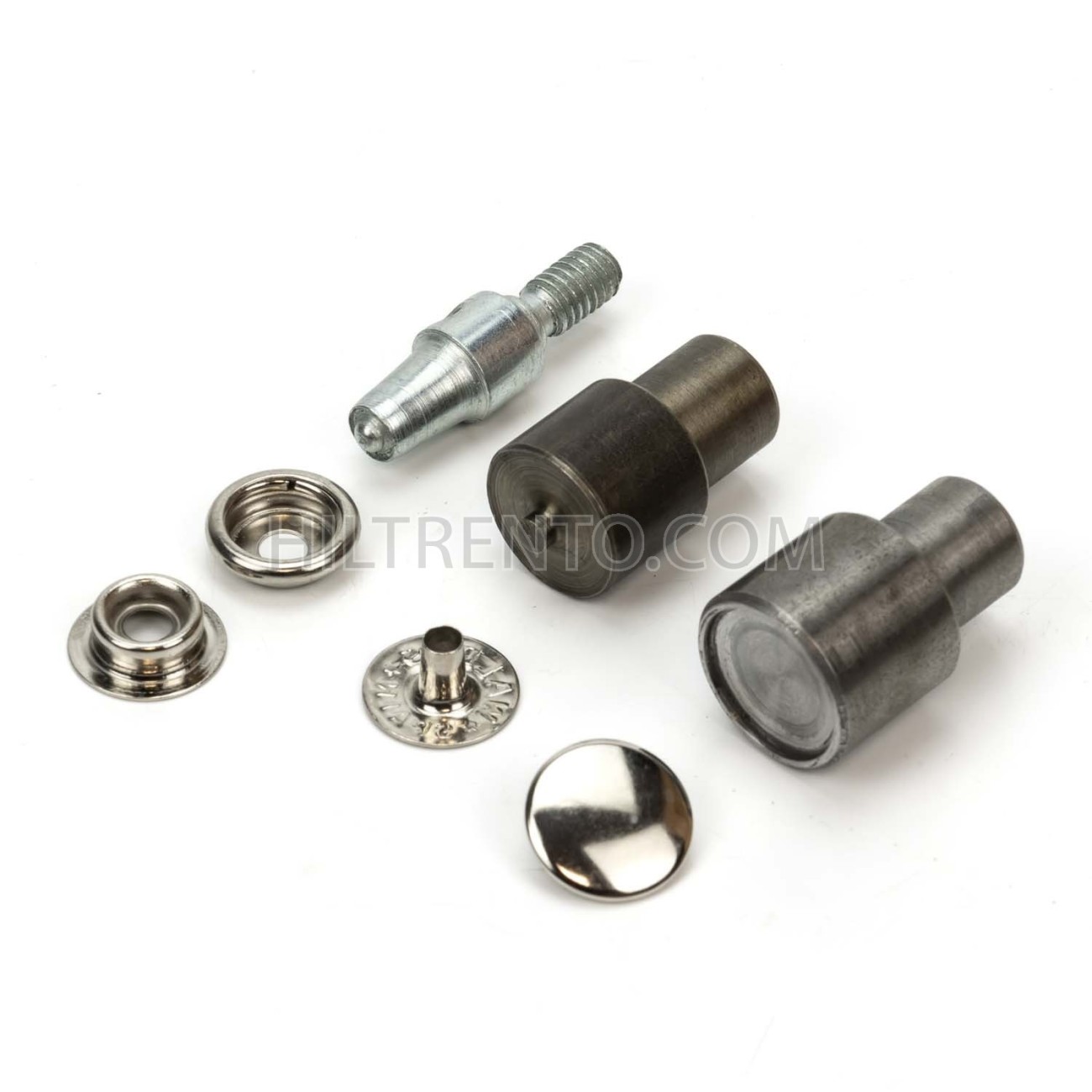 Troqueles, también llamados boquillas, para colocar el broche rayo 8100 de la marca waldes. Consta de 3 piezas. Un troquel que coloca el pinche, otro troquel que sirve para colocar tanto el macho como la hebmbra. El troquel que coloca el calote está disponible en varios tamaños y depende del tamaño del calote que vayas a colocar, tendrás que comprar su correspondiente troquel