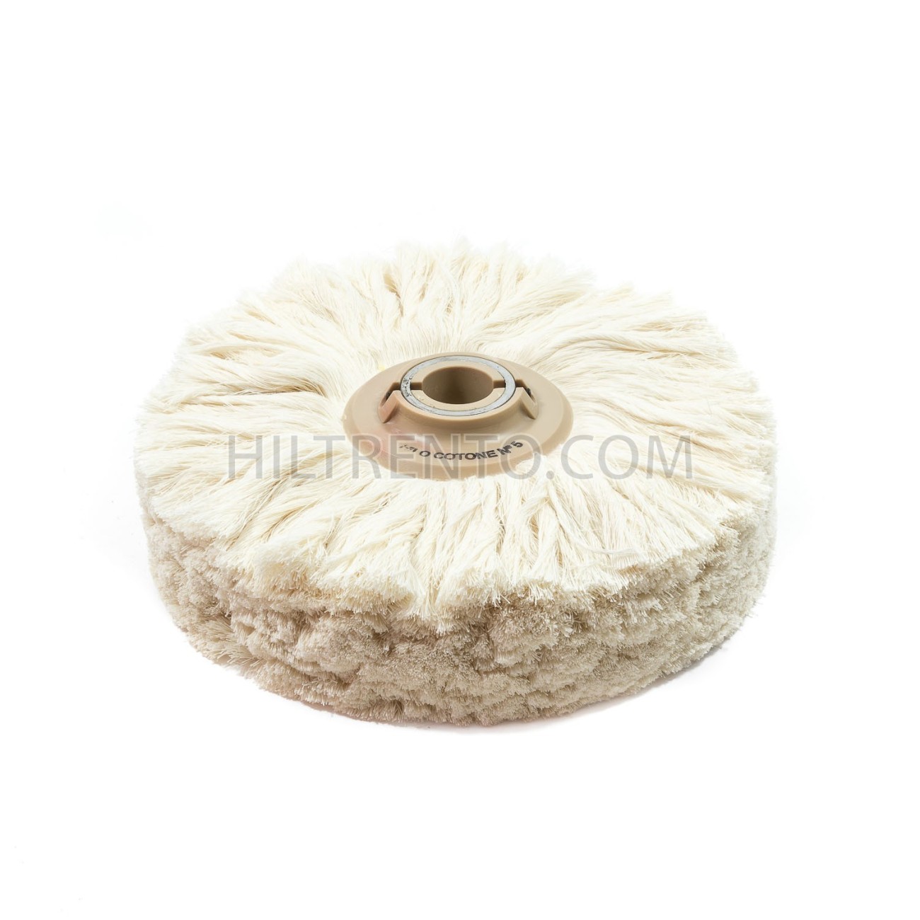 Los cepillos de hilo de algodón suave se utilizan para abrillantado final, especialmente en cuero liso y artículos de calzado o marroquinería. Retienen el producto de manera uniforme, permitiendo también aplicar ceras y cremas de forma controlada y progresiva. Son ideales para obtener un brillo intenso y duradero, así como para lograr acabados graduales y efectos uniformes sin dañar la superficie. Aunque su uso principal es en la industria del cuero y calzado, también se aplican en otros materiales que requieran cuidado delicado y pulido de alta calidad.