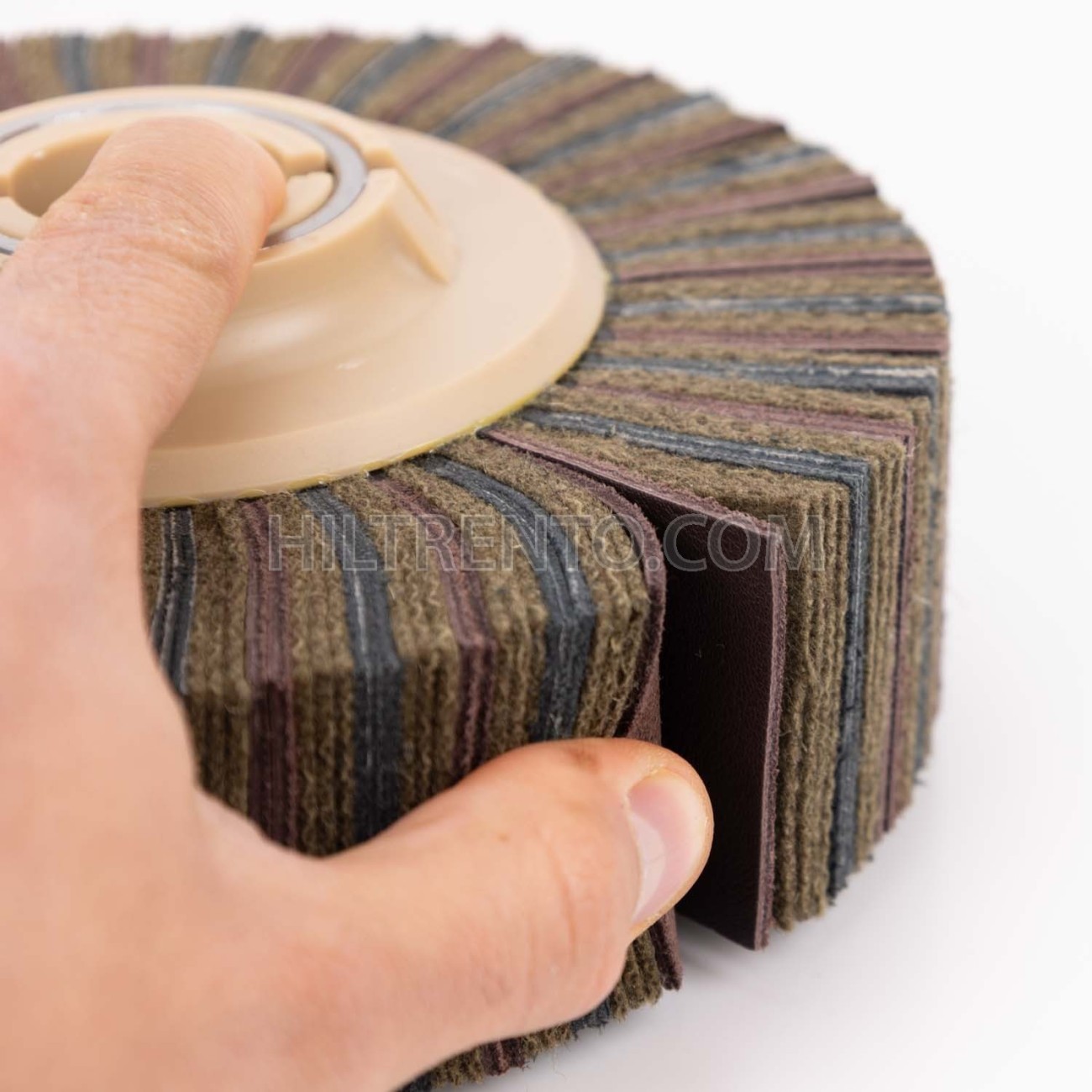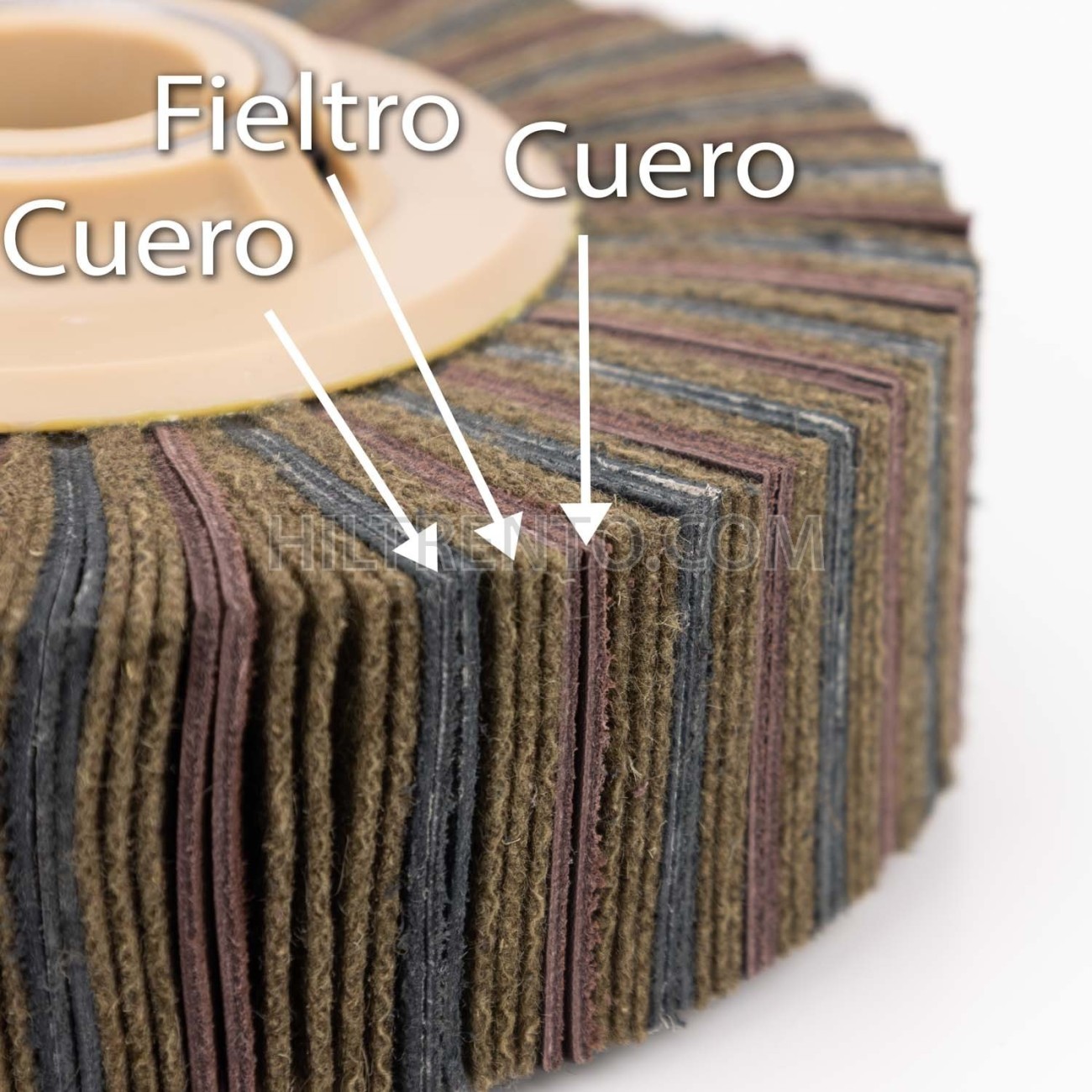 Cepillo compuesto por una mezcla de cuero y fieltro de lana para para máquinas rotativas. Se utiliza para eliminar rebabas y restos de materiales, como sobrantes de adhesivos, bordes del cuero en la industria del calzado, afinar piezas plásticas o de goma en la industria del plástico, etc. Incluye 3 discos de paño de fieltro de lana + 2 de cuero. El cuero hace la función de desbaste y arrastre del material sobrante mientras que el fieltro alisa y limpia la superficie.