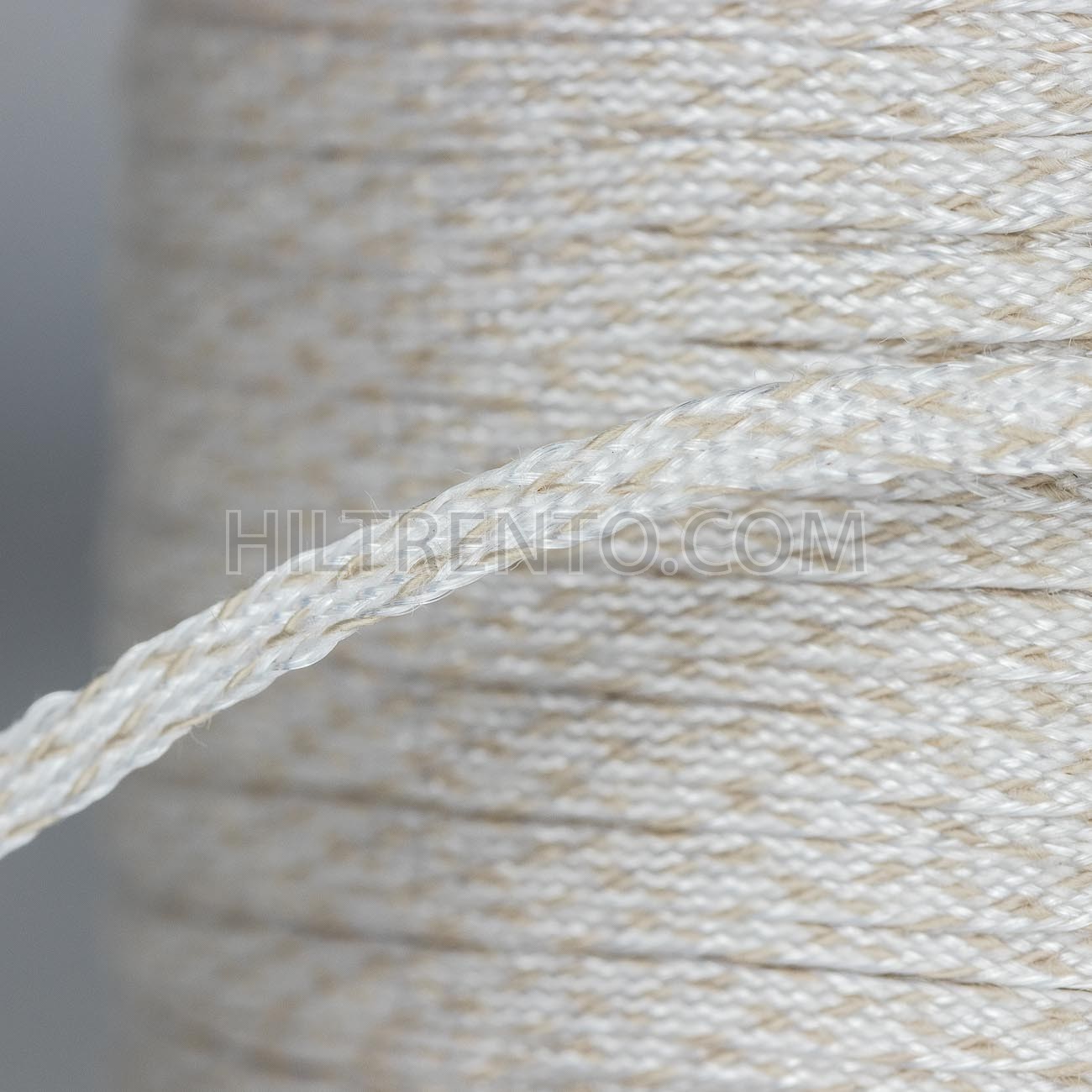 Cinta trenzada mixta para coser dobladillos a máquina en el proceso de fabricación del calzado. También llamada cinta de refuerzo. Compuesta de algodón y nylon. Acabado suave al tacto y brillante. El trenzado se compone de una mezcla de color blanco con detalles en beig. Cinta plana de 3 mm de ancho