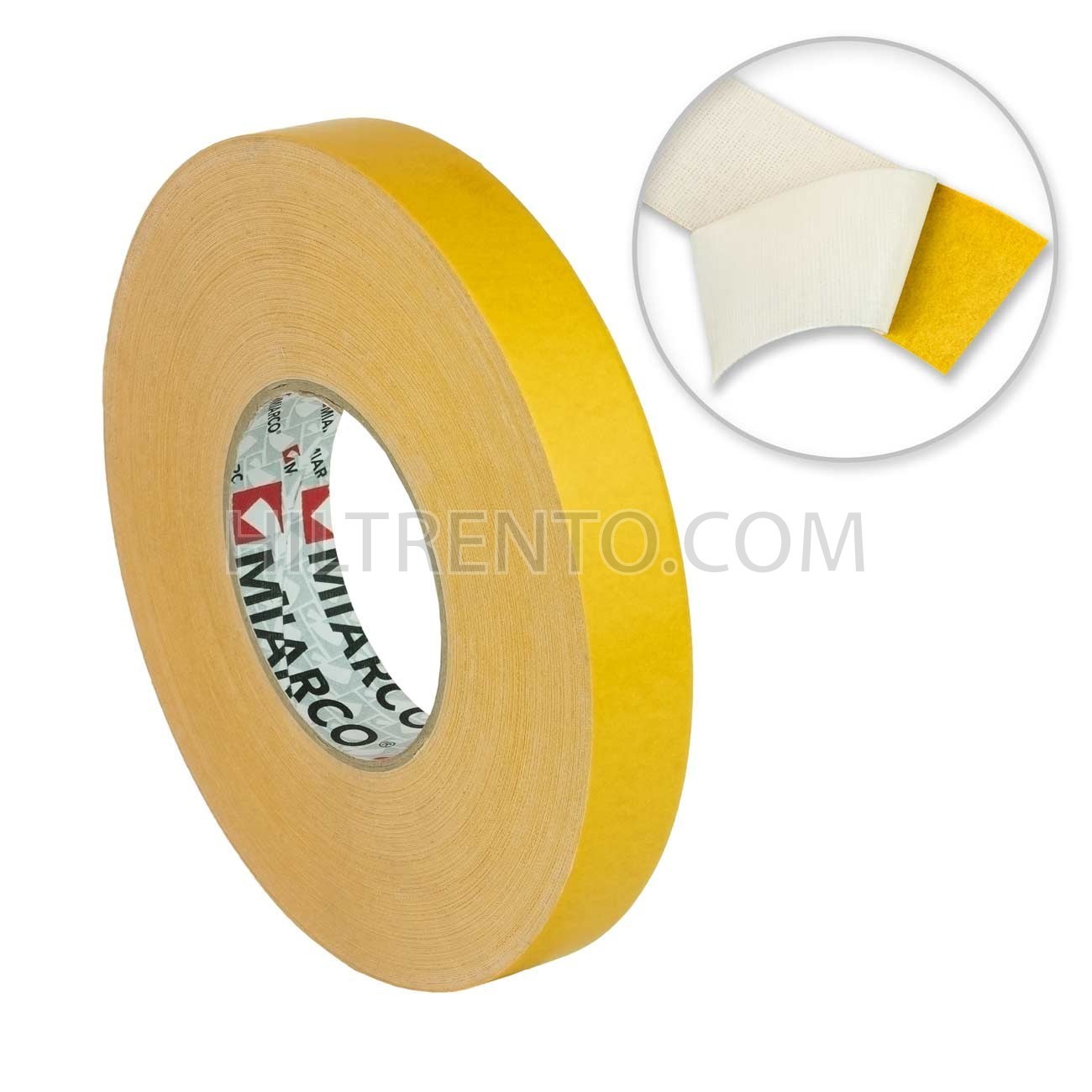 Cinta doble cara gruesa para superficies rugosas o porosas. No deja restos al despegar. Formada por una lámina de papel siliconado y una malla adhesiva de algodón. Se despega sin romperse.