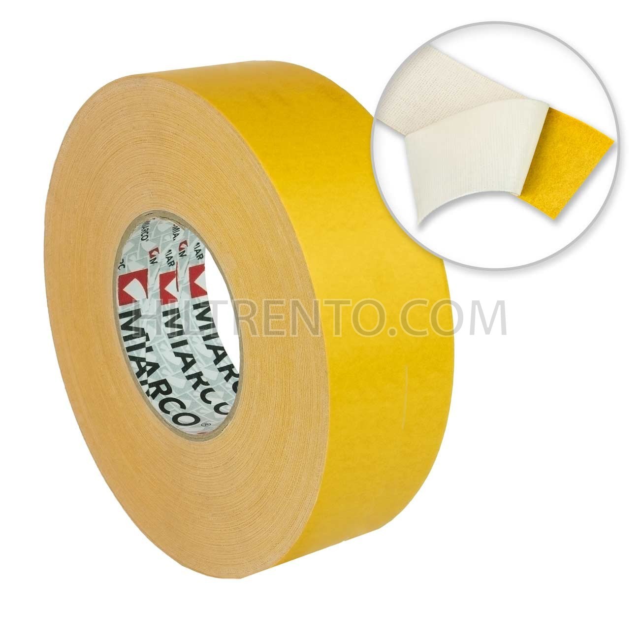 Cinta doble cara gruesa para superficies rugosas o porosas. No deja restos al despegar. Formada por una lámina de papel siliconado y una malla adhesiva de algodón. Se despega sin romperse.