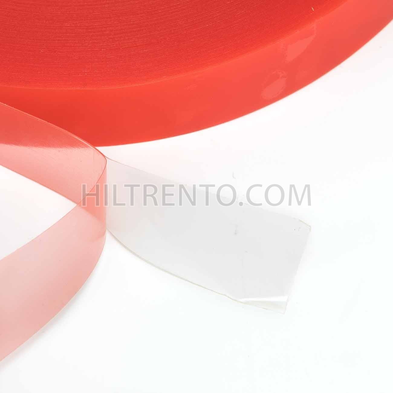 Cinta biadhesiva doble cara con soporte de poliéster transparente, adhesivo acrílico y protectivo de polipropileno monorientado rojo.