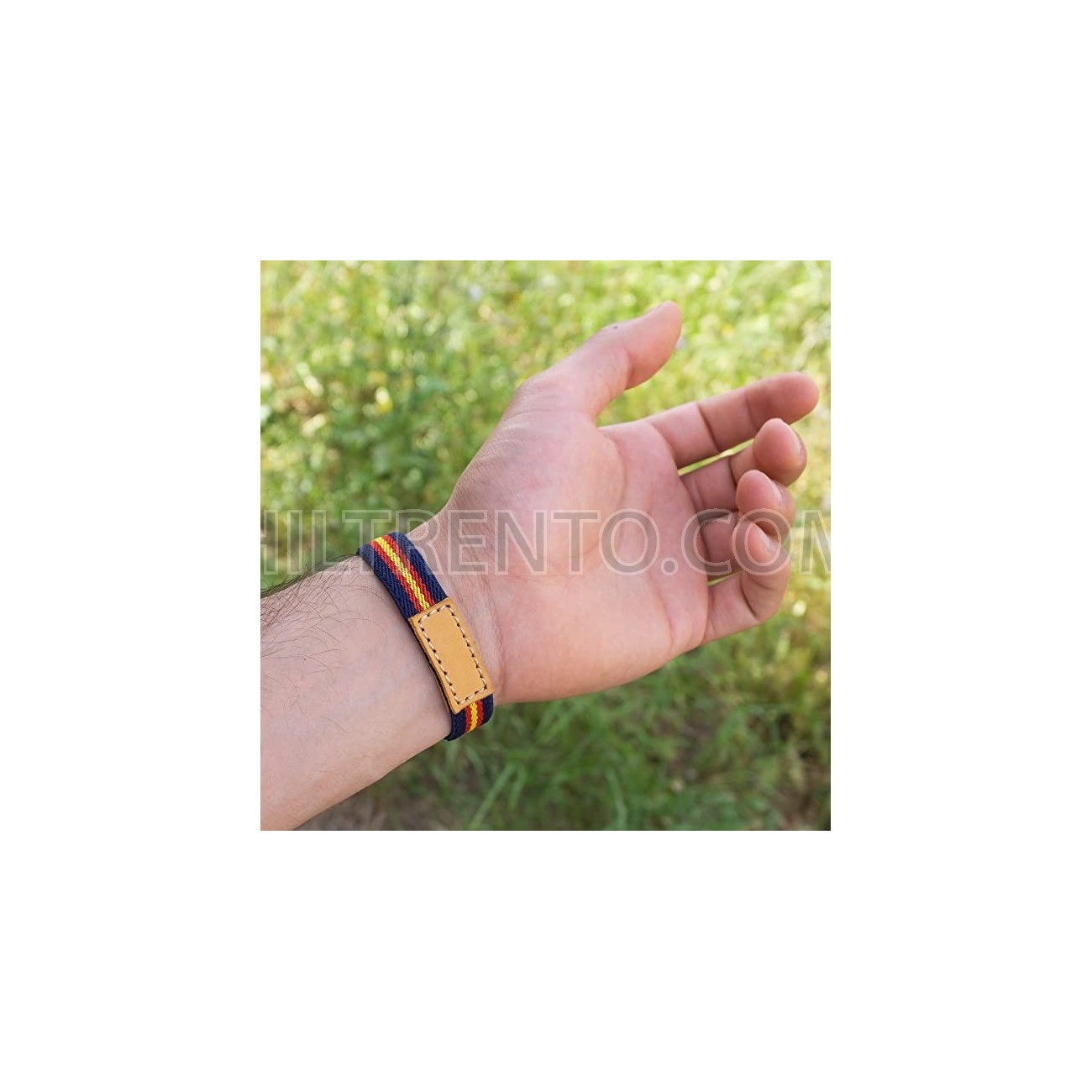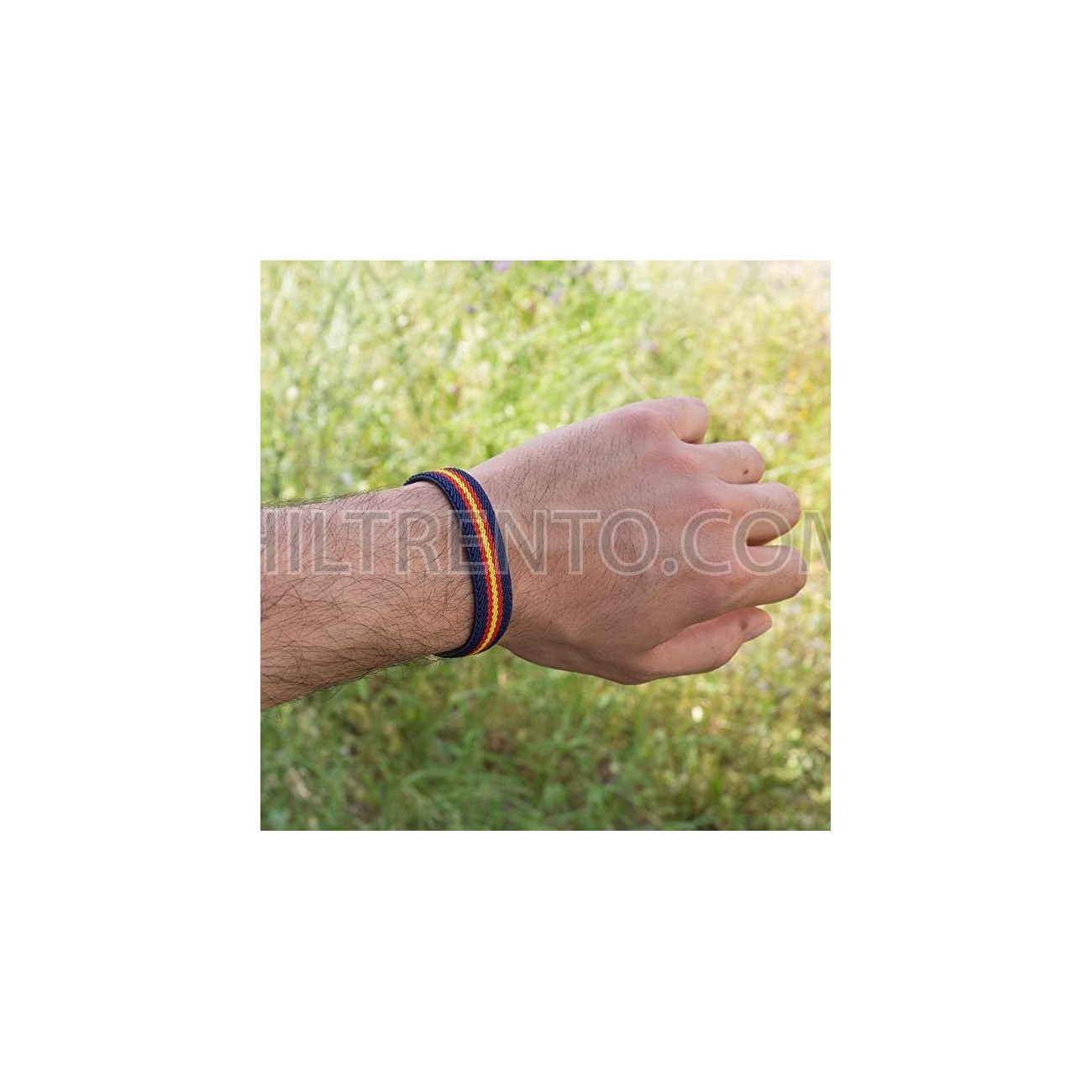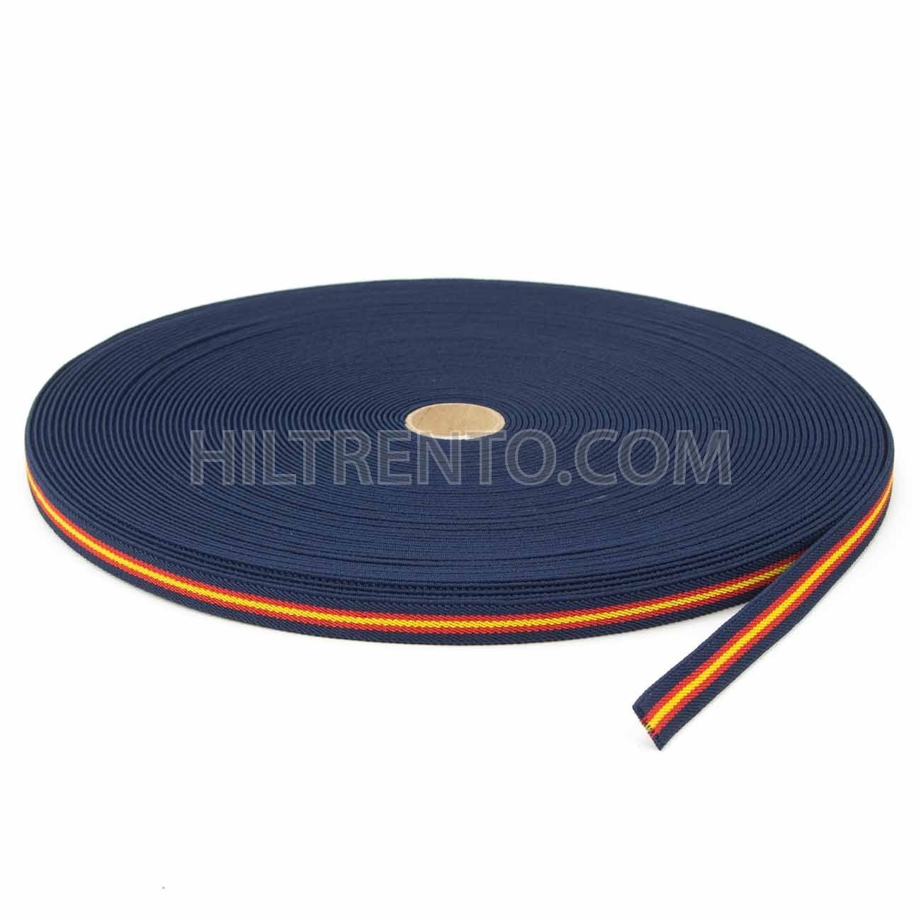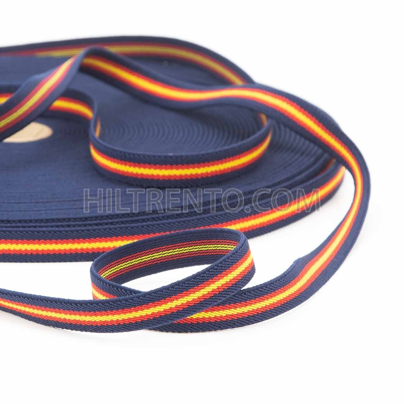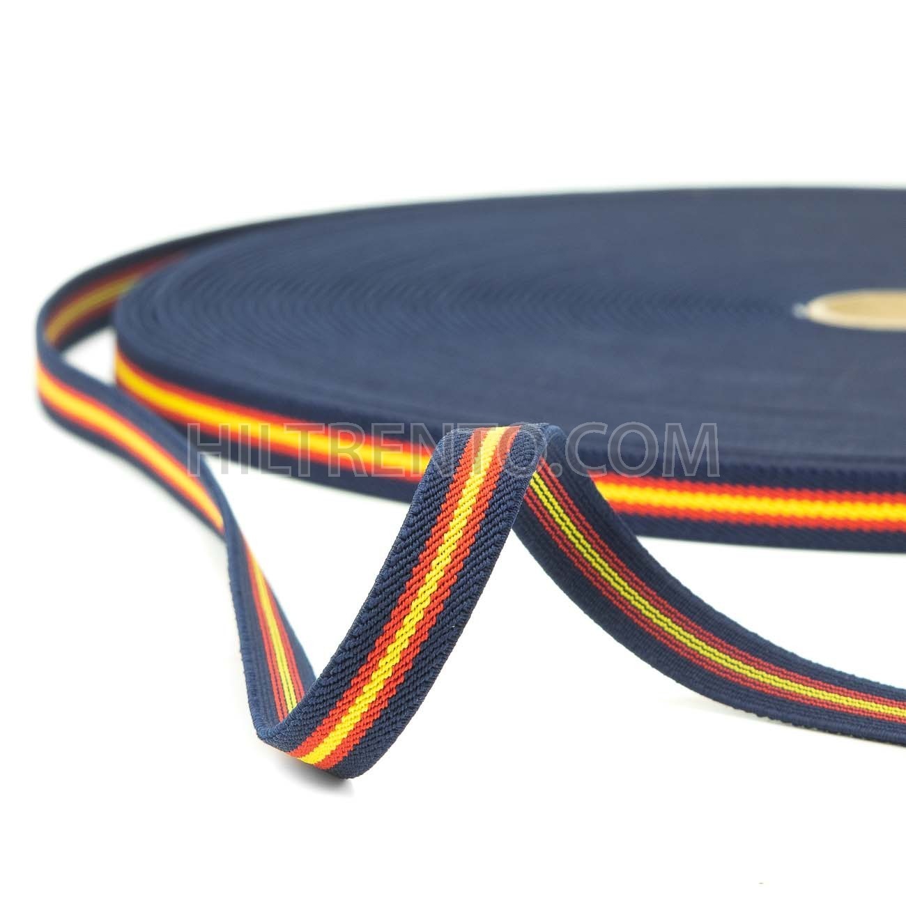Elástico plano de 15 mm de anchura, con la bandera de España a lo largo de toda la cinta sobre un fondo azul marino. Este diseño es el que se usa para la policía nacional, también para nautica. Cinta trenzada en telar con trama en disposición diagonal para un acabado de alta calidad. Poca rigidez, por lo que es muy cómoda de llevar cuando se utiliza para pulseras o accesorios que requieran contacto con la piel.
