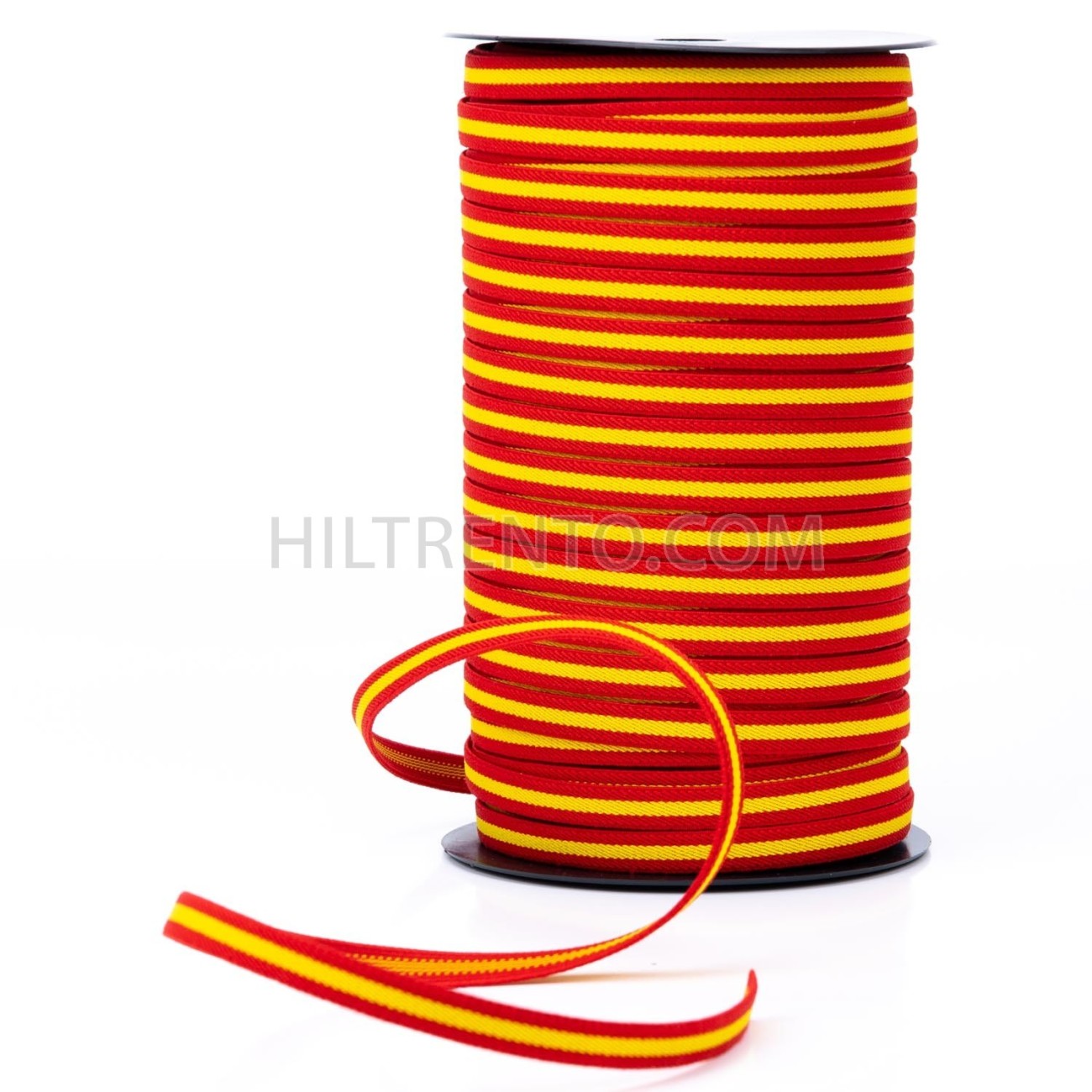 Elástico plano de 10 mm de anchura, con la bandera de España a lo largo de toda la cinta. Cinta trenzada en telar con trama en disposición diagonal para un acabado de alta calidad. Cómoda de llevar cuando se utiliza para pulseras o accesorios que requieran contacto con la piel.