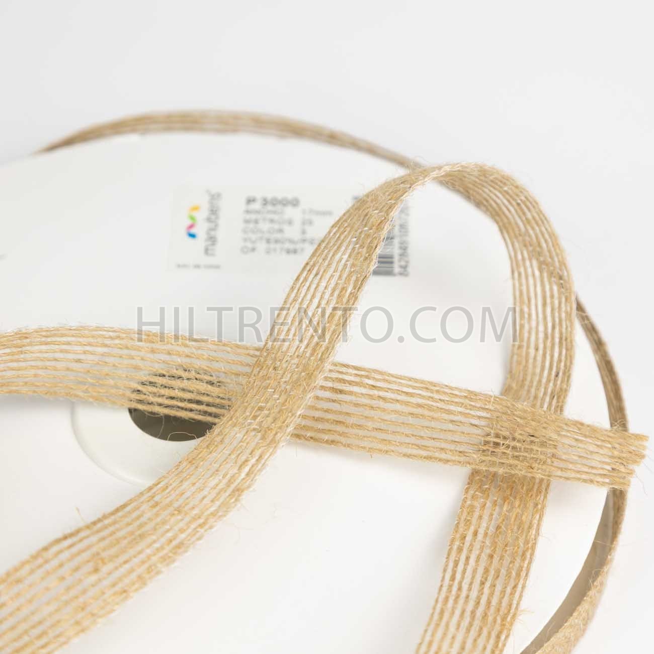 Cinta de yute o arpillera fabricada a partir de fibras naturales. Acabado rústico y natural. Se utiliza para envolver paquetes y sobres, detalles de bodas y comuniones, para envolver jarrones, frascos y botellas, decorar cajas, etc. También se usa para sombreros o pamelas de fiesta y boda.