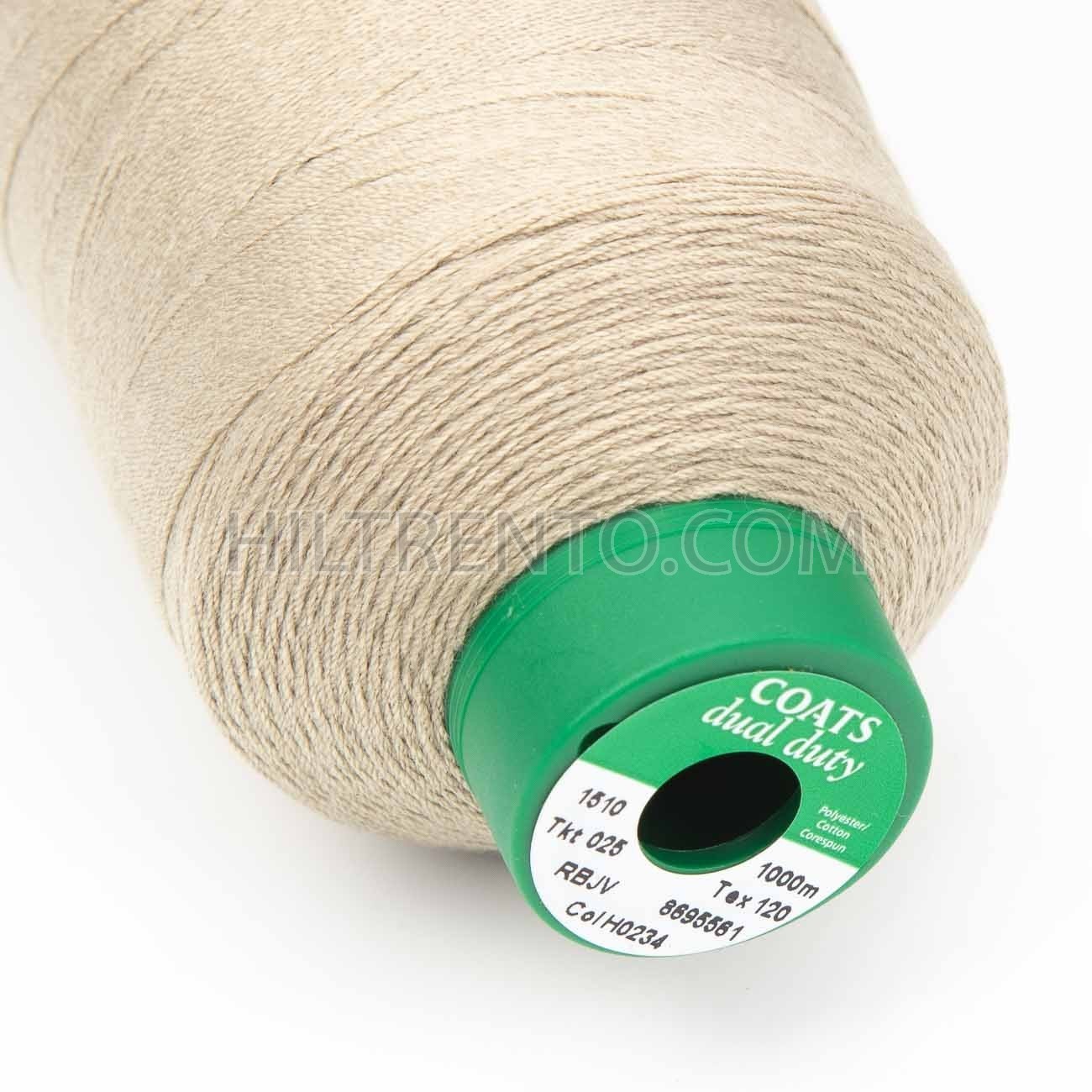 Hilo coats (koban) dual duty 25 de alta calidad con alma de poliéster de alta tenacidad para una muy alta resistencia. Cuenta con un recubrimiento exterior de algodón que ofrece un tacto suave y natural y un alma extremadamente resistente. El recubrimiento aporta resistencia a la temperatura y buen rendimiento al coserlo a máquina. También llamado "Polyester cotton corespun"