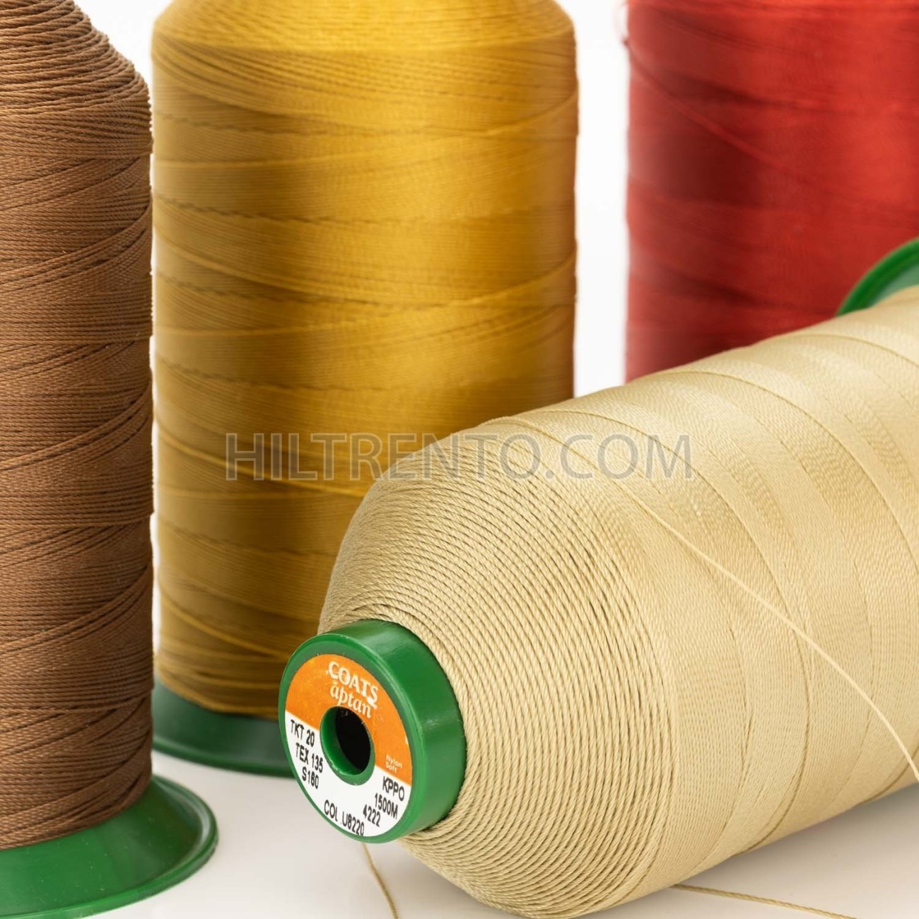 Hilo coats aptan numero 20, 100% poliamida 6.6, nylon. Alta tenacidad y muy buena relación entre resistencia y finura. Mayor resistencia que los hilos de poliéster similares y mejores propiedades de elongación para una óptima formación de bucles y puntadas ajustadas. Superficie tratada con un lubricante especial que mejora la fricción y permite una gran velocidad de costura.