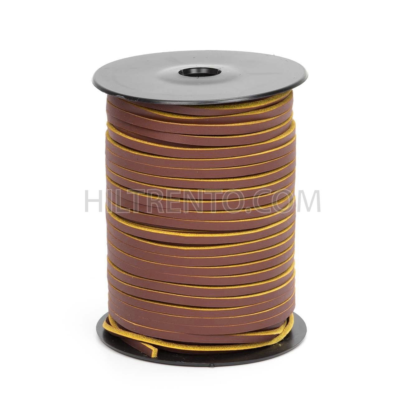 Cordón náutico fabricado en piel flor. Color cuero-marrón y amarillo en el lateral. Se utiliza para zapatos náuticos, como cordonera, fabricación de bolsos, marroquinería y gran variedad de labores de artesanía. Forma plana con 4 lados.