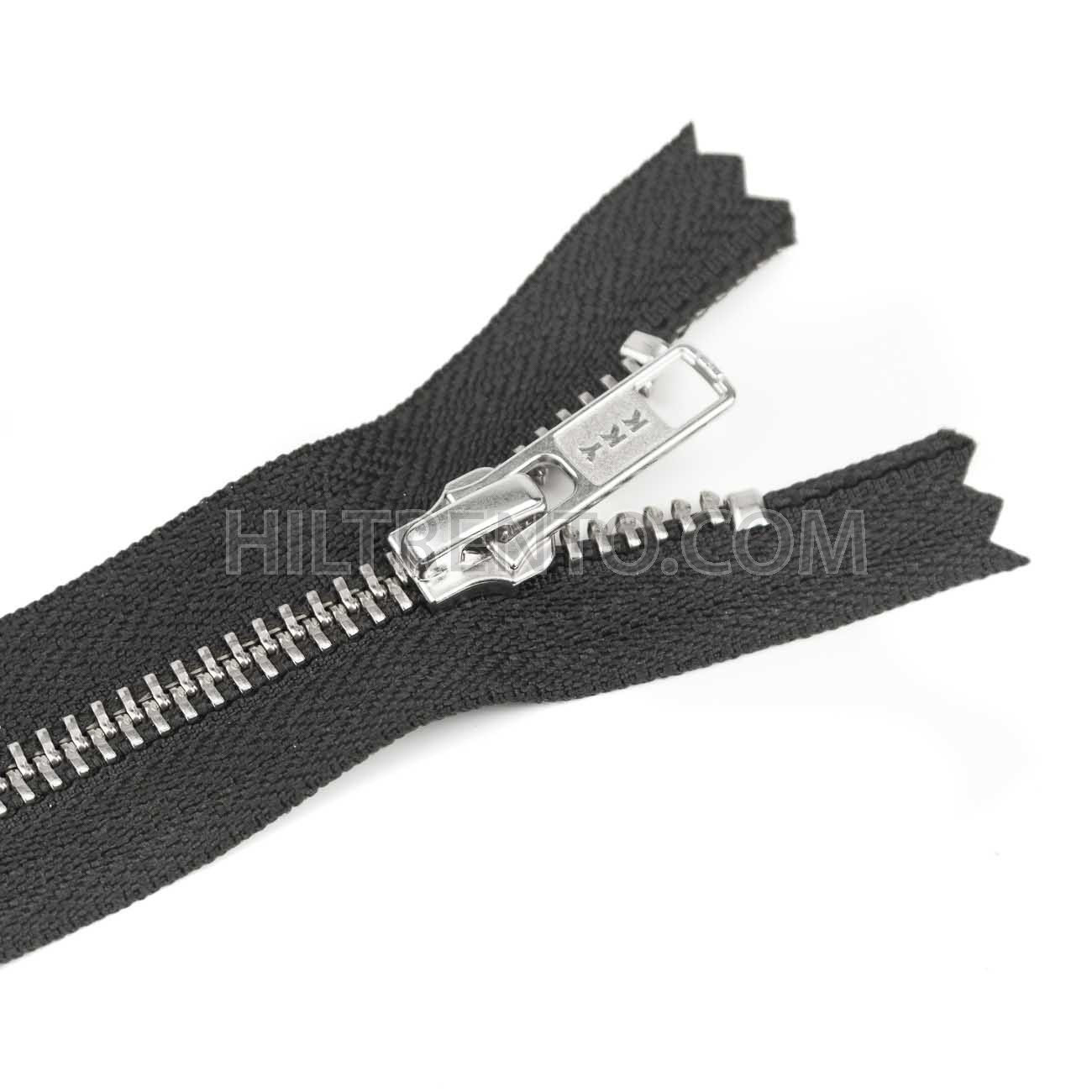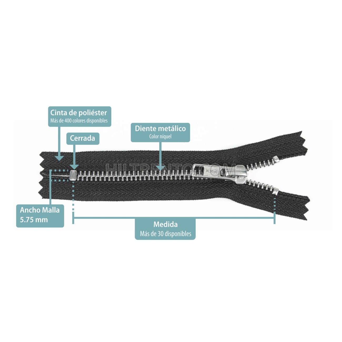 Cremallera YKK malla 5, con cinta de poliéster en múltiples colores, cursor metálico y diente de color níquel.
