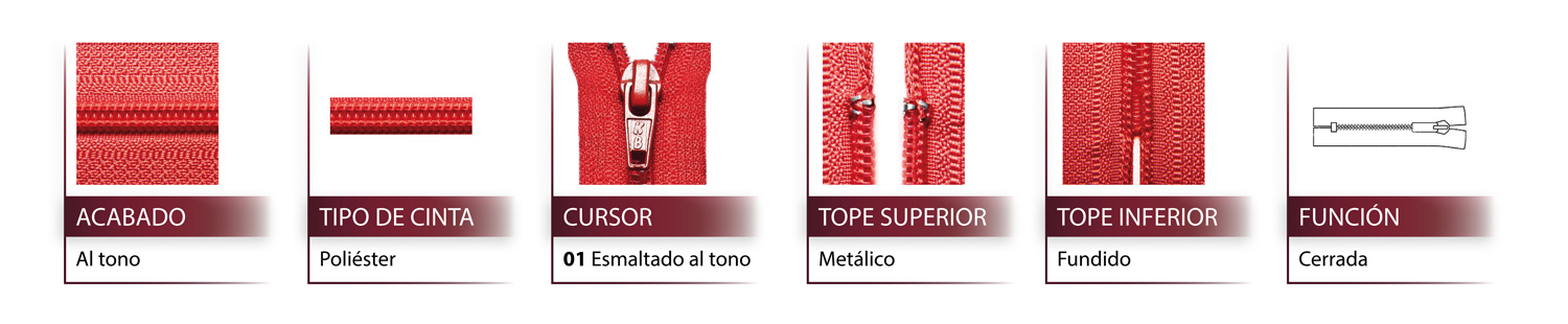 Cremallera KB (Kreband) espiral 7 con cinta de poliéster y acabados del cursor y el tejido al mismo tono. Disponen de tope superior metálico y tope inferior soldado. Cerradas por los dos extremos. KB es una reconodida marca Española.
