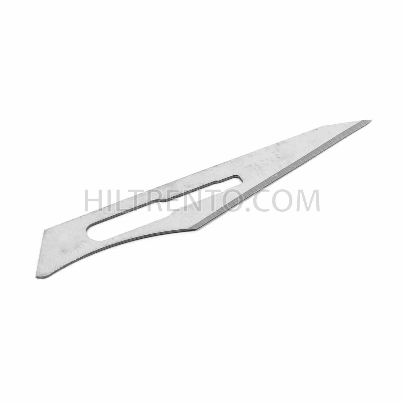 Cuchilla de bisturí quirúrgico Nº 26 de acero al carbono. Forma recta con punta muy penetrante y afilada.