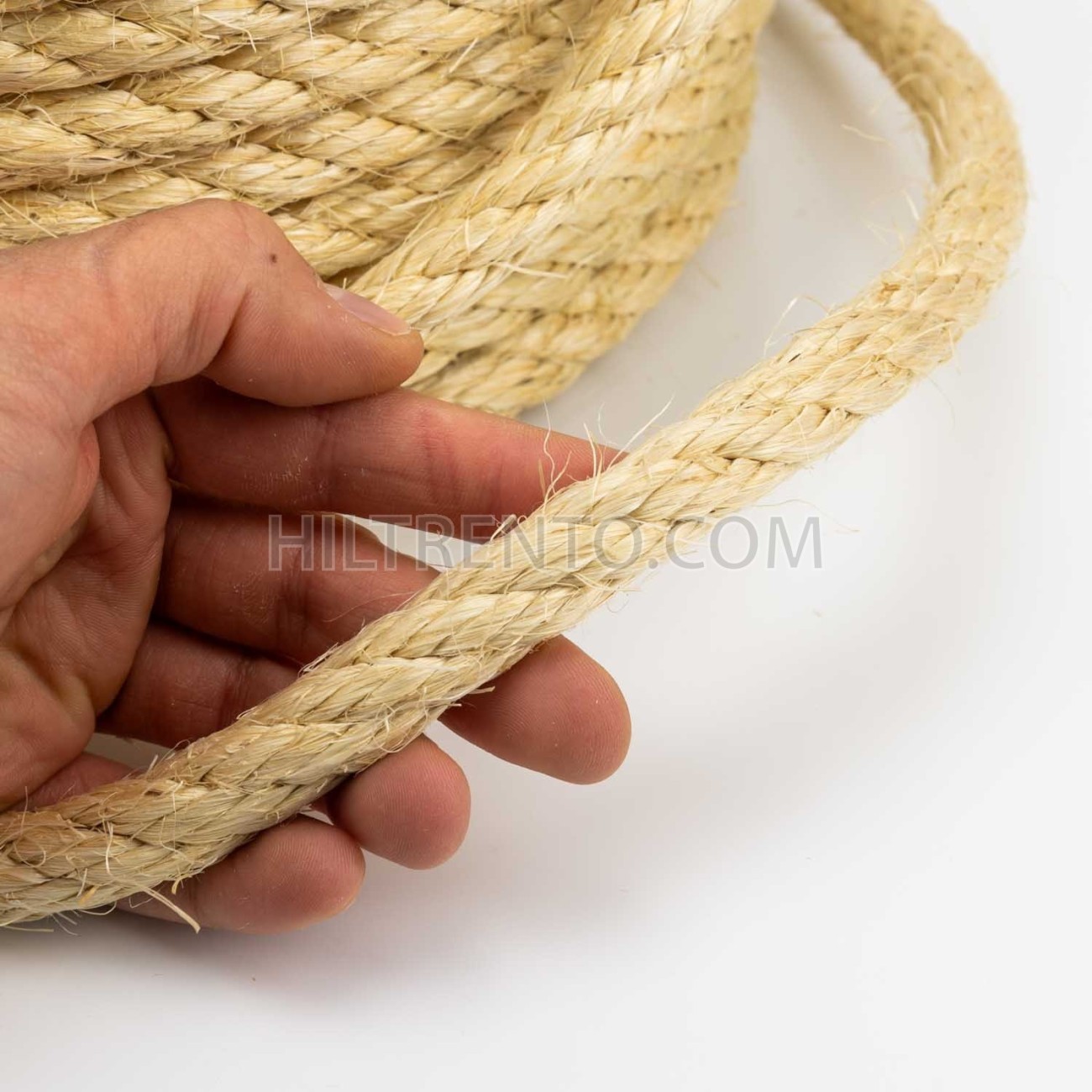 Cuerda gruesa torcida a 4 cabos, fabricada con fibras naturales de sisal, muy resistente. Seguridad total de nudo ya que nunca se deshace debido a la fricción entre sus fibras. Gran resistencia a la tracción con una buena capacidad de agarre. EL sisal es una fibra natural muy usada en cordelería.