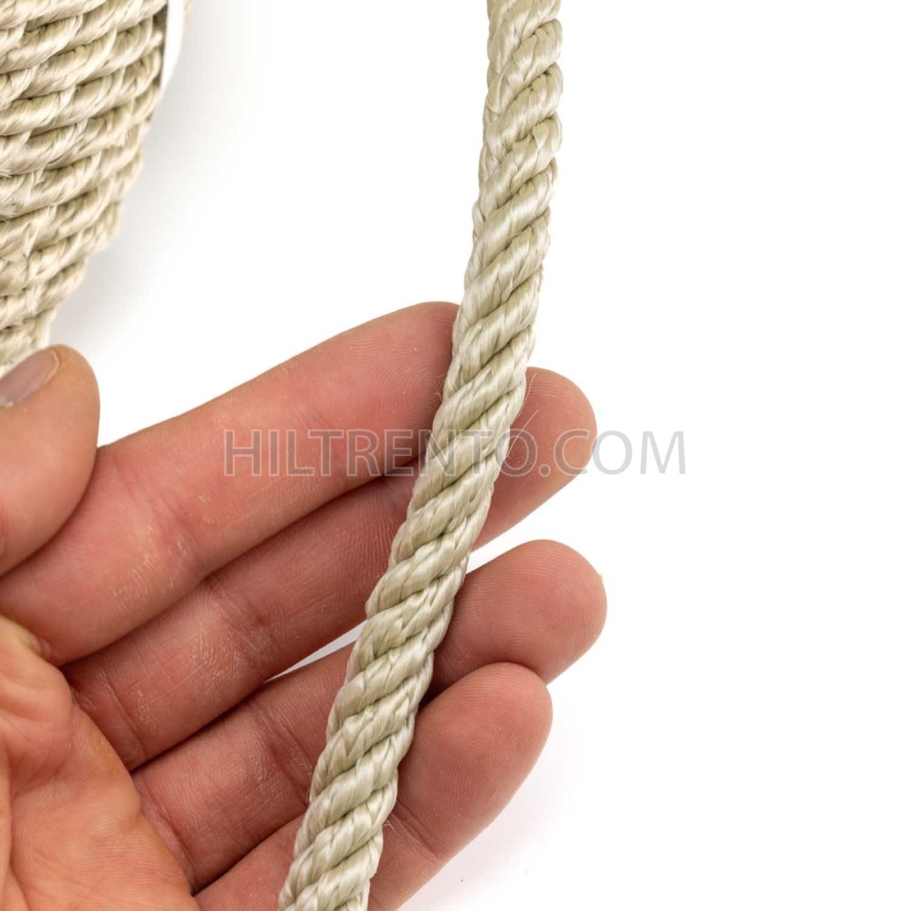 Cuerda sintética de imitación al cáñamo natural, compuesta de multifilamentos de polipropileno. Torcida a 4 cabos. Gran flexibilidad y suavidad al tacto. Buena resistencia a la tracción y al roce. Se usa principalmente en decoración, para forrar artículos, pasamanos, colgar cuadros y lámparas, colgar espejos, barandillas, separadores de filas. También en construcción, transporte, etc.