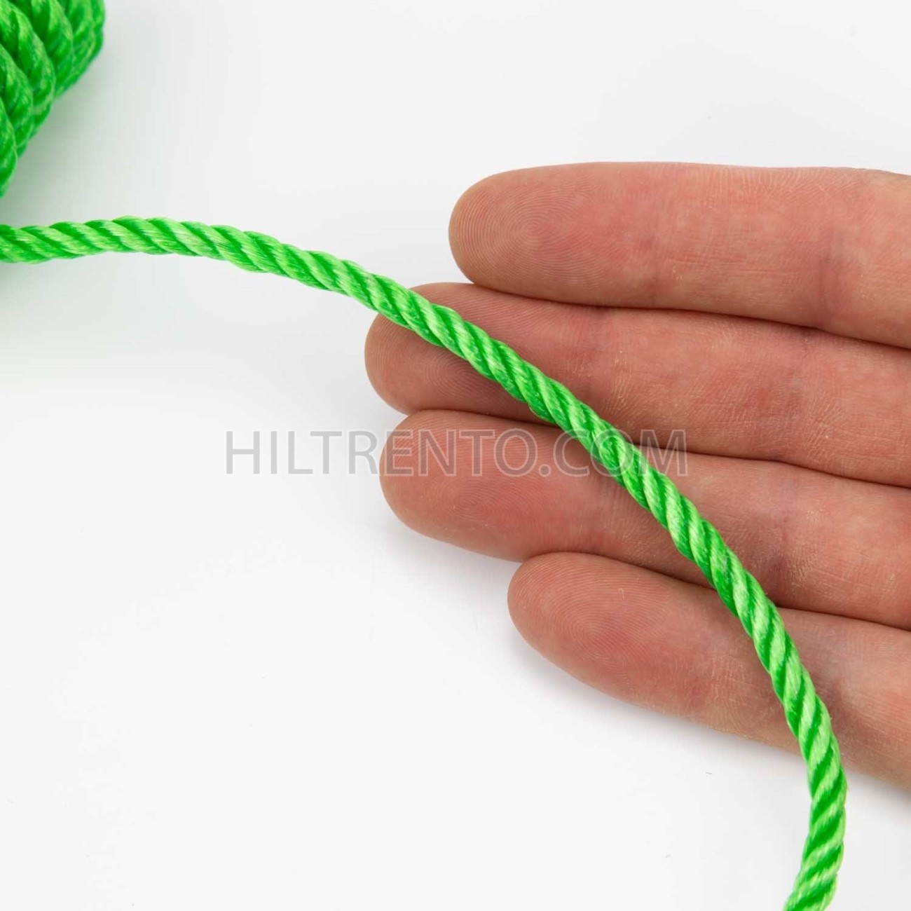 Cuerda compuesta de monofilamentos de polietileno torcidos a 4 cabos. Buena resistencia a la tracción. Rigidez media. Múltiples utilidades como atado de lonas, transporte, náutica, pesca, agricultura, etc.