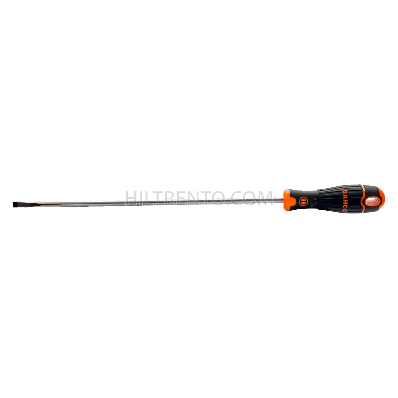 Destornillador de punta recta con mango ergonómico antideslizante de goma, de la marca Bahco. Para tornillos con cabeza plana y varilla de electricista. Es ideal para los tornillos de las regletas de conexiones eléctricas. El destornillador está fabricado con la punta fosfatada y la varilla de aleación de acero cromada, que garantiza la máxima precisión y protección a la corrosión. El mango incorpora un agujero para poder colgarlo y el símbolo de la punta para ser identificado rápidamente.
