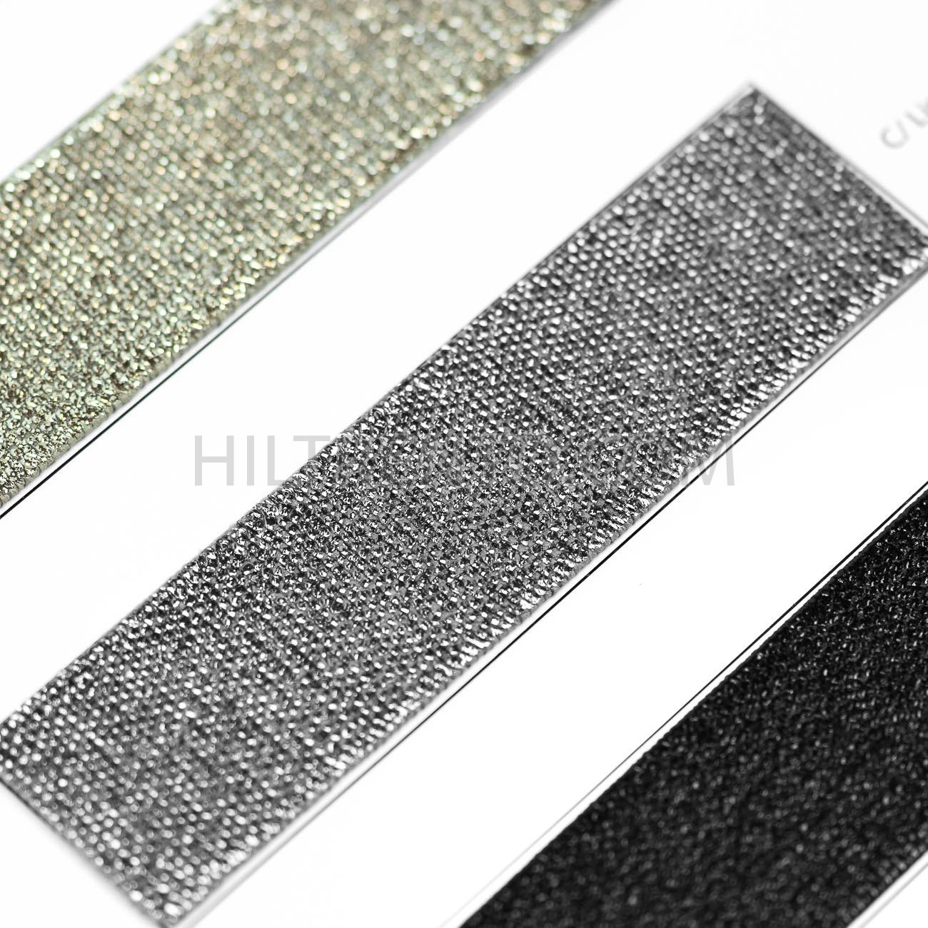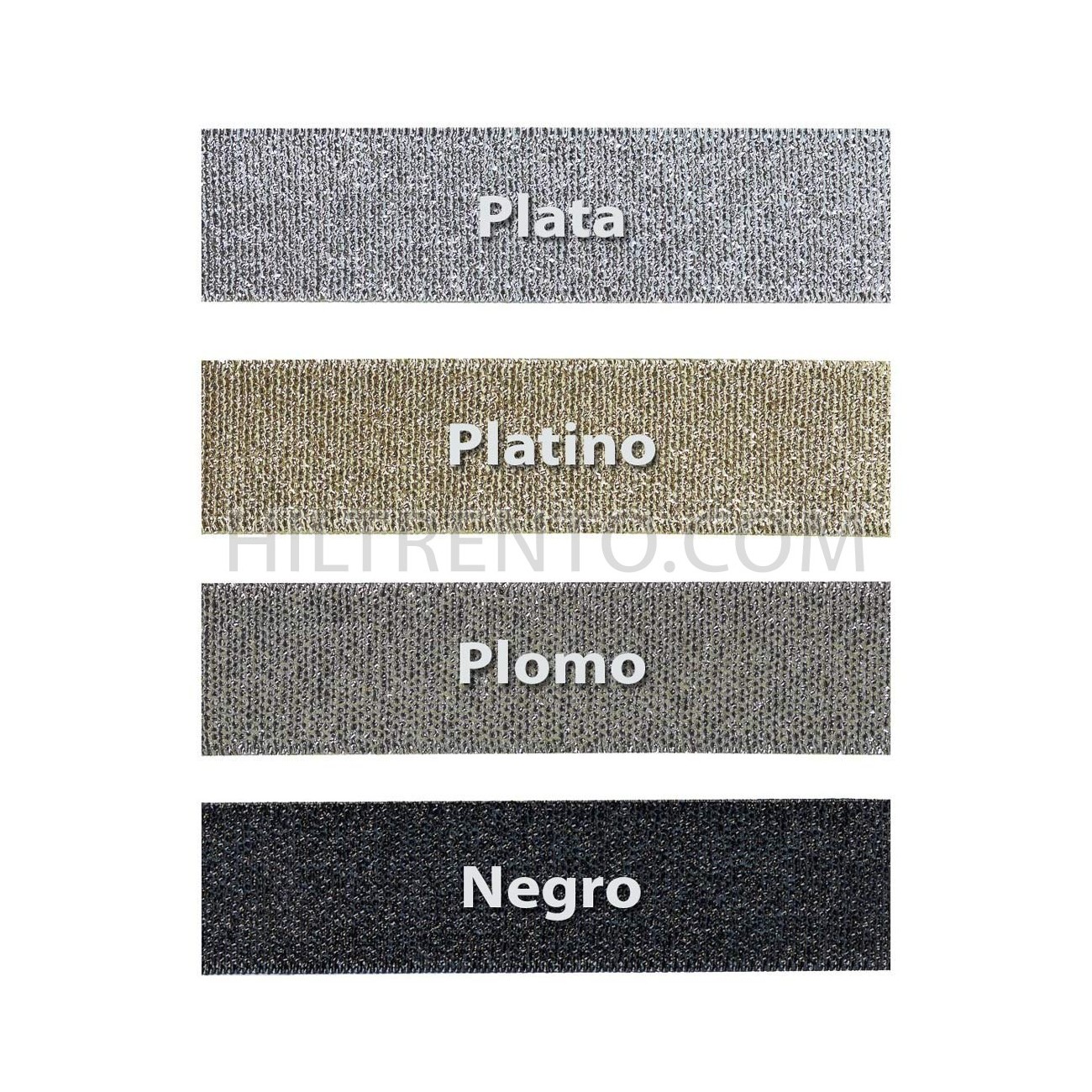 Rollo de elástico laminado con acabado metalizado sobre base de lino natural. Una de las caras va laminada con el metalizado, la otra cara es de lino natural color beig, excepto el negro que es de lino natural tintado.