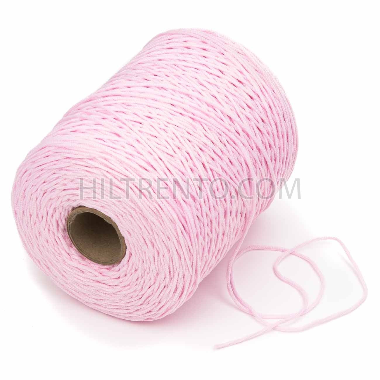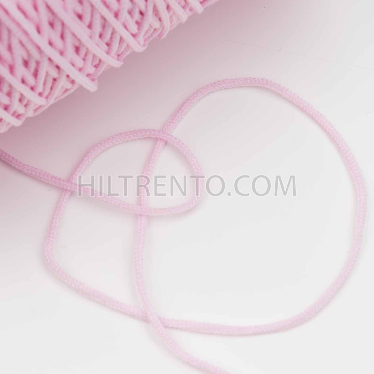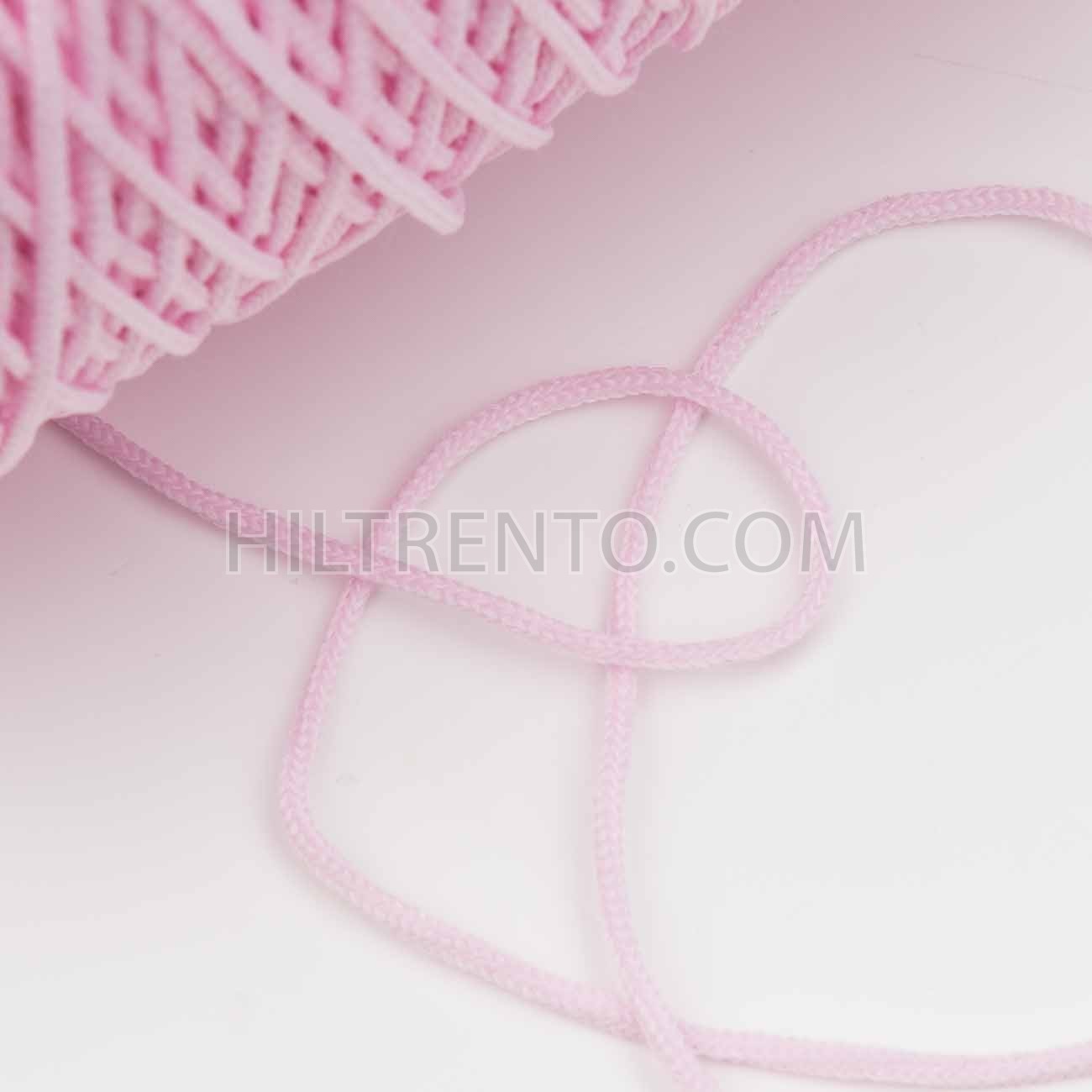 Cordón elástico redondo, color rosa claro, tejido en poliéster y elastano, de gran suavidad. Ofrece muy poca resistencia al estiramiento, por lo que es ideal para fabricar mascarillas quirúrgicas profesionales, aportando gran comodidad debido a su textura de filamentos finos.