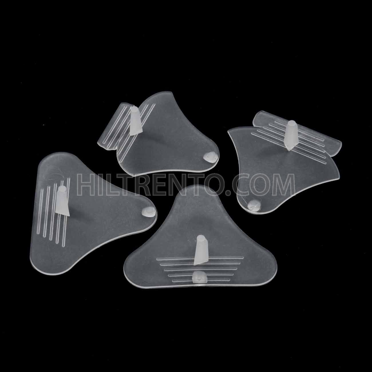 Complemento grande con forma triangular que se introduce en el extremo hueco del palillo para calzado para que al apoyar sobre el material no lo dañe ni deje marcas. Transparente.