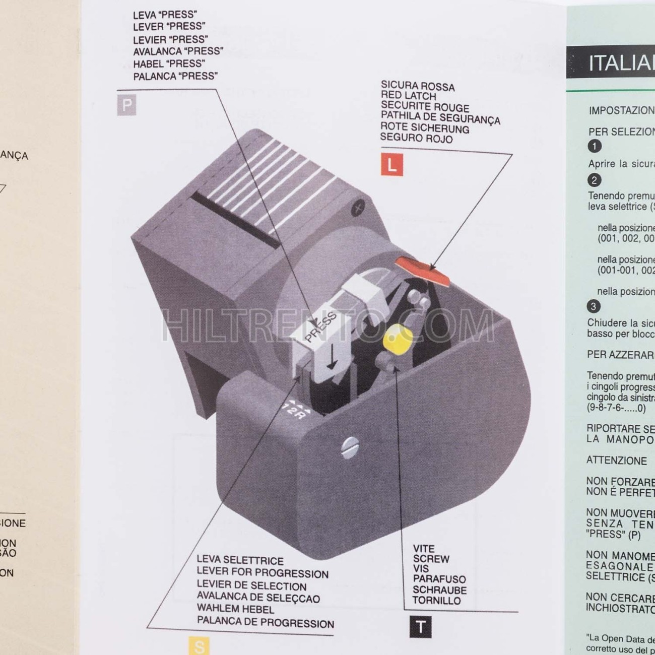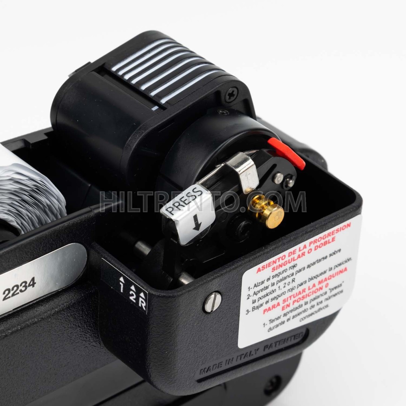 Máquina para poner tallas de ropa y números consecutivos. Las 3 primeras posiciones de la izquierda quedan fijas, permitiendo poner números del 0 al 9 en cada banda o tallas: F, C, Q, S, M, L, XL, XXL, etc. Las 4 posiciones de la derecha son para colocar números que van saltando de forma consecutiva de 1 en 1, de 2 en 2 o se pueden dejar fijos. (del 0001 al 9999)