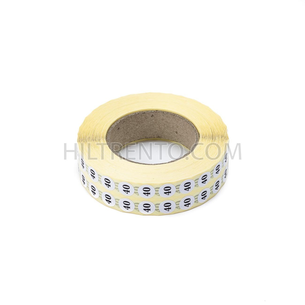 <p>Rollo de etiquetas adhesivas de papel para calzado, útiles para indicar el número de pié del zapato. Fondo blanco y numeración en negro.</p>