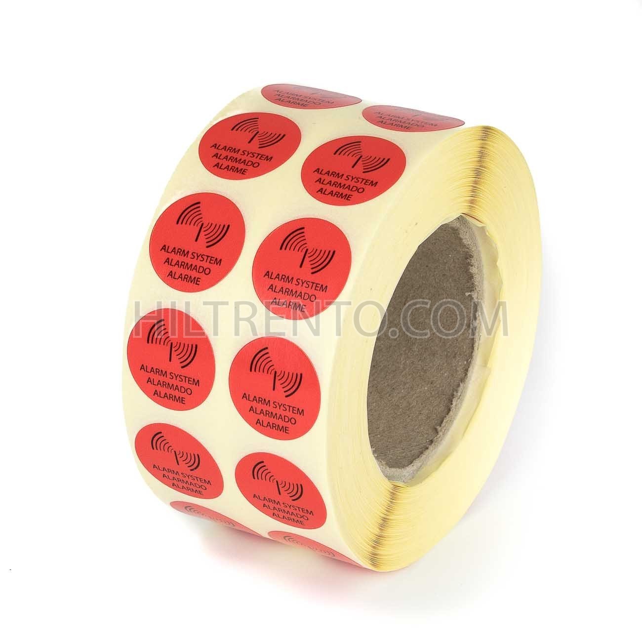 Rollo de 2500 etiquetas adhesivas circulares con el texto "alarma, alarm system" y un dibujo de antena de radiofrecuencia.