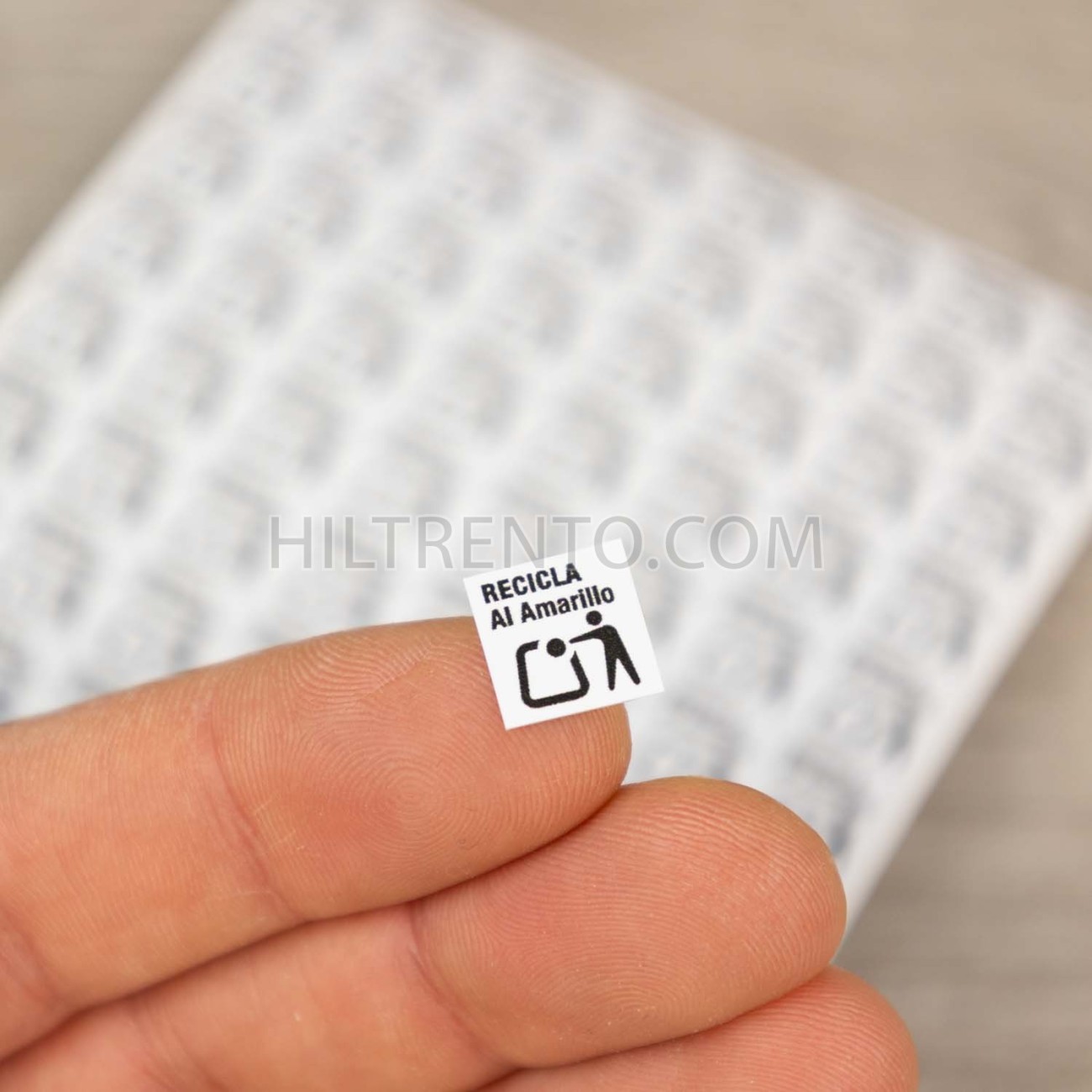 Etiquetas blancas cuadradas con el Símbolo para el reciclado de envases ecoembes de la nueva normativa del Real Decreto 1055/2022, de uso obligatorio desde enero 2025. Fabricadas en plástico, aptas para pegar en cualquier tipo de envases. No se degradan al mojarlas. Estas etiquetas indican en que contenedor hay que desechar el envase.