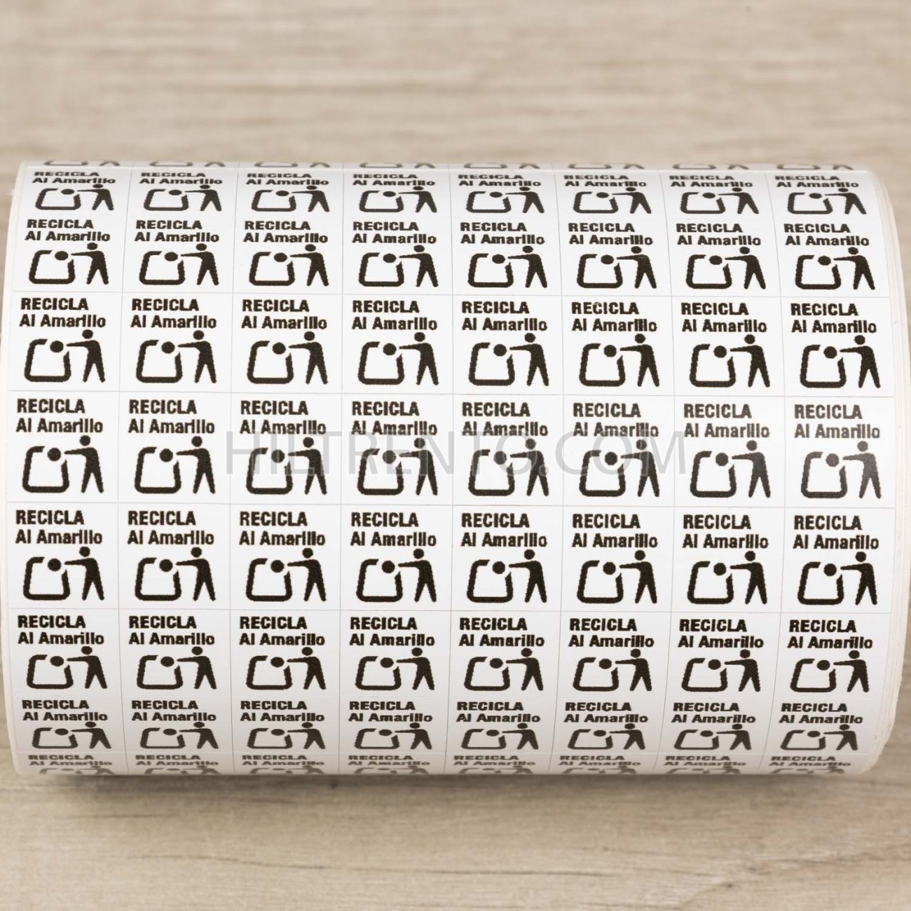Etiquetas adhesivas polipropileno 10 mm "recicla al amarillo" fondo blanco, ecoembes - Rollo 600 uds