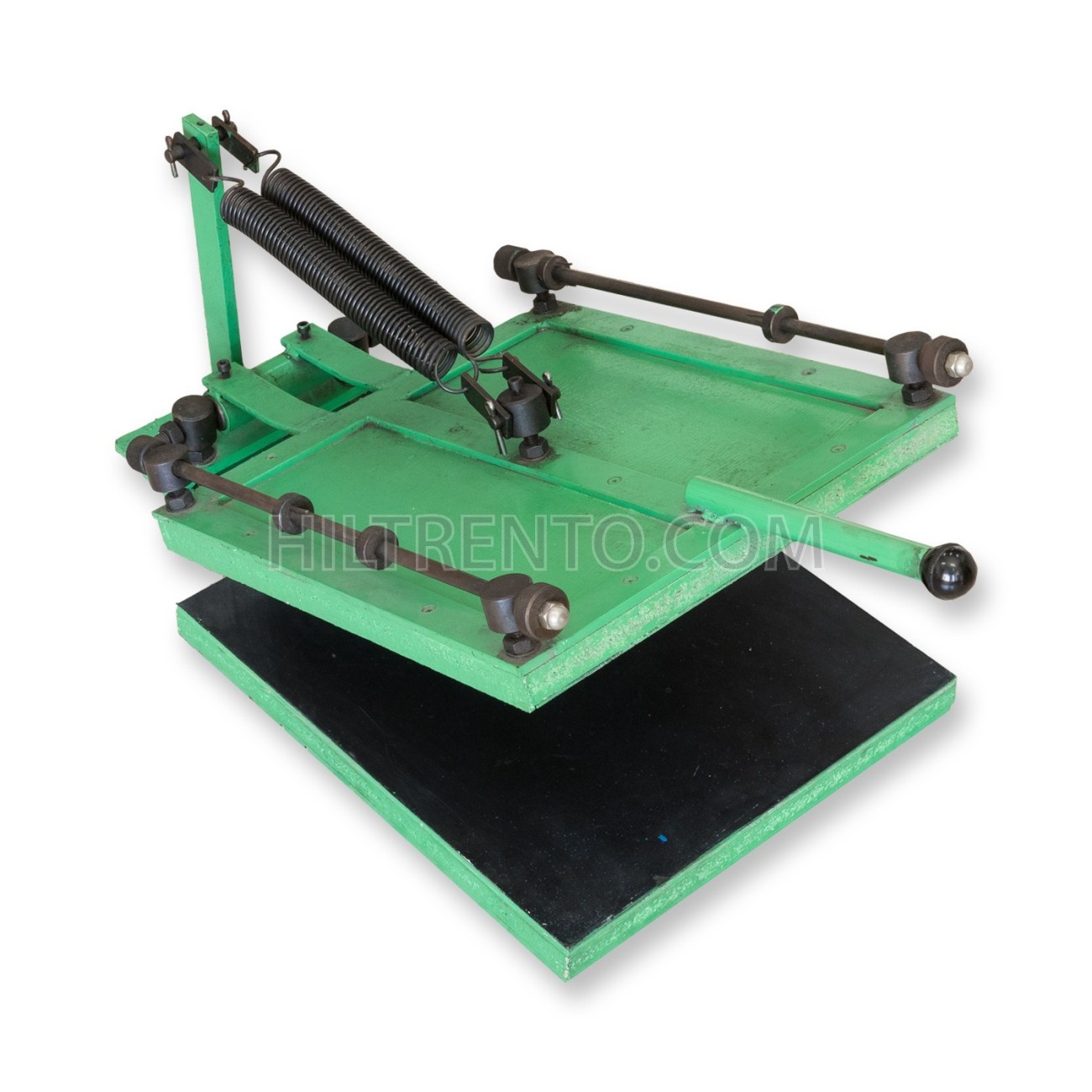 Maquina para figurar botas en la industria del calzado. Sirve para grabar el patrón sobre el material a cortar, ejerciendo presión entre la lámina que incorpora la tinta y el cuero o la piel.