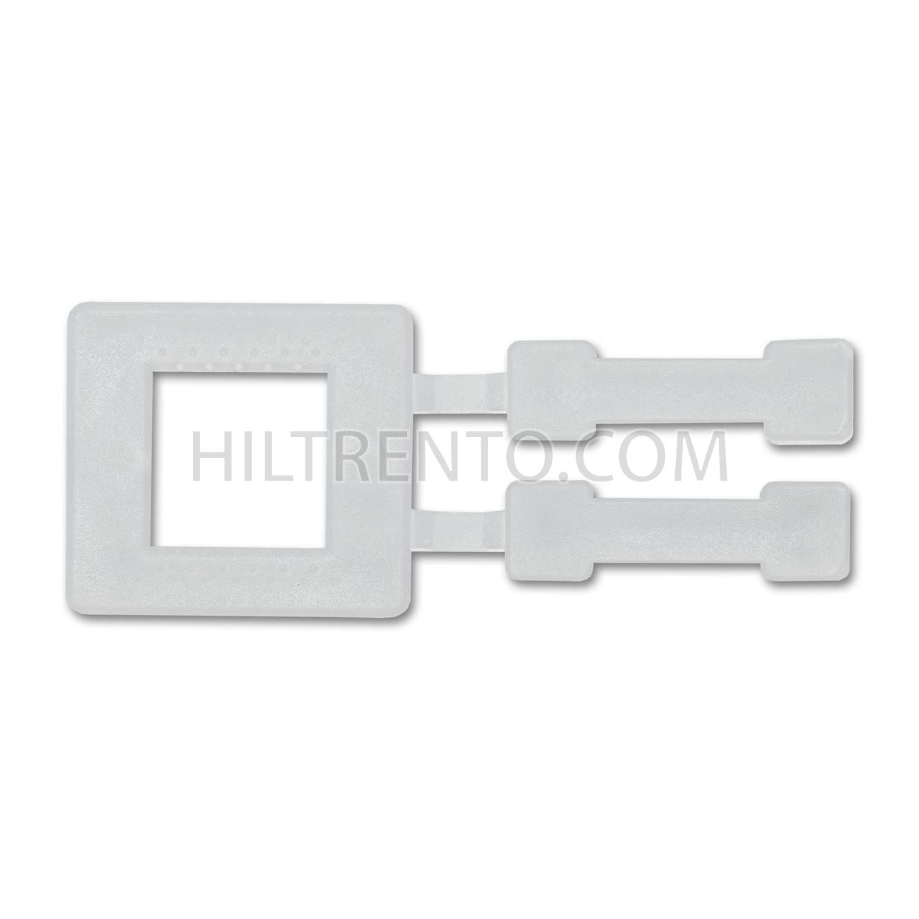 Hebilla de plástico (polipropileno) para sujetar el fleje al flejar la mercancía. Sirve para pasar ajustar y apretar el fleje con fuerza para asegurar la mercancía.