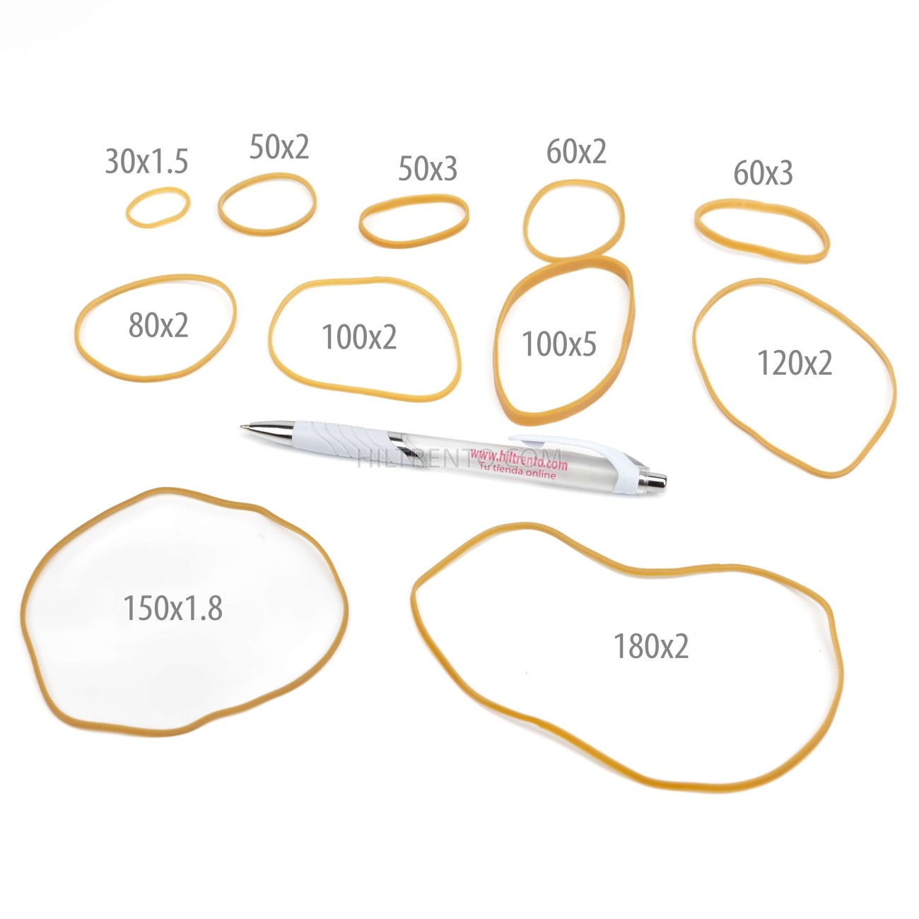 Gomas elásticas de anillo para sujetar y atar productos. Se utilizan para sujetar documentos, papel y cartón enrollado, para la utilización con alimentos, atar ramos de flores, fruta, hortalizas, plantas, sujetar tallos, en oficina, calzado, y un sinfín de posibilidades.