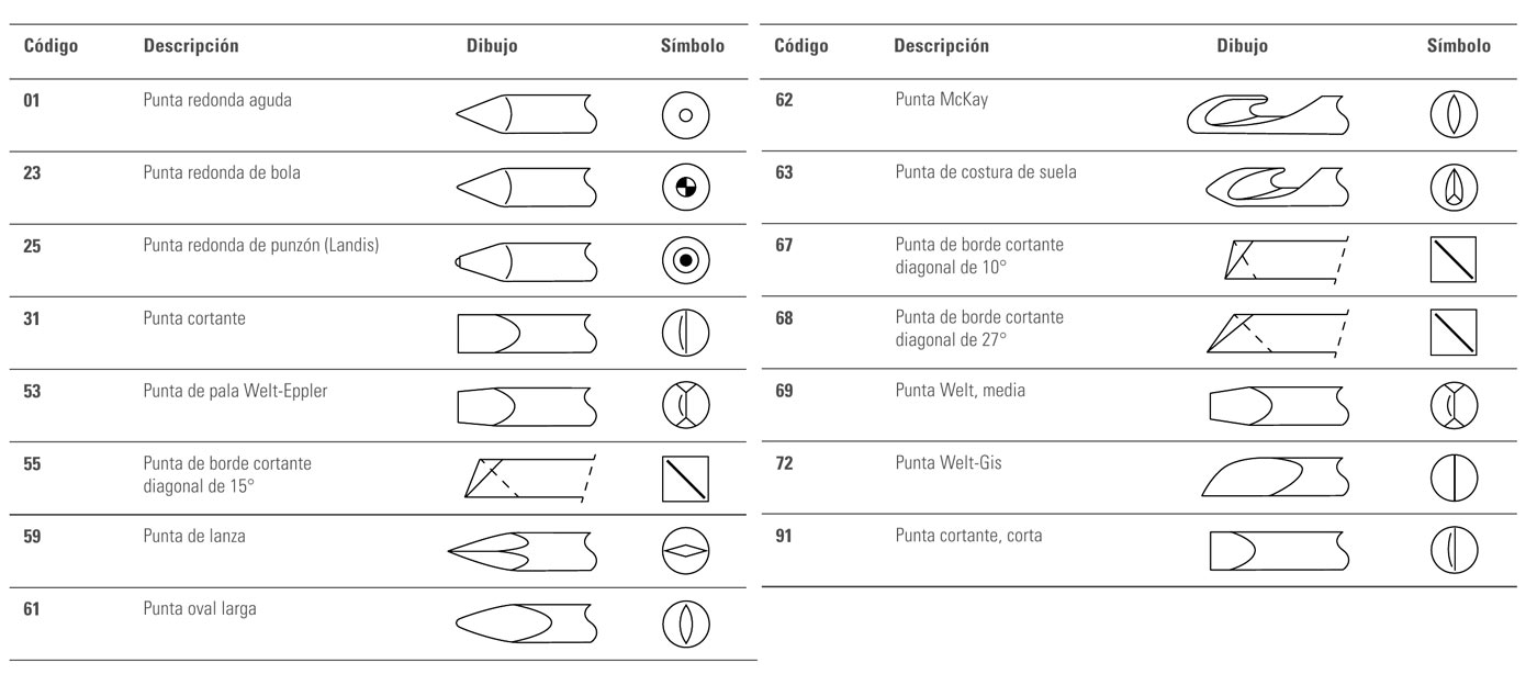 Existen diversos tipos de puntas adaptadas al tipo de trabajo requerido al coser las suelas y cortes del zapato. Cada punta realiza una función determinada por los materiales a coser, el acabado necesario, el tipo de calzado, etc.