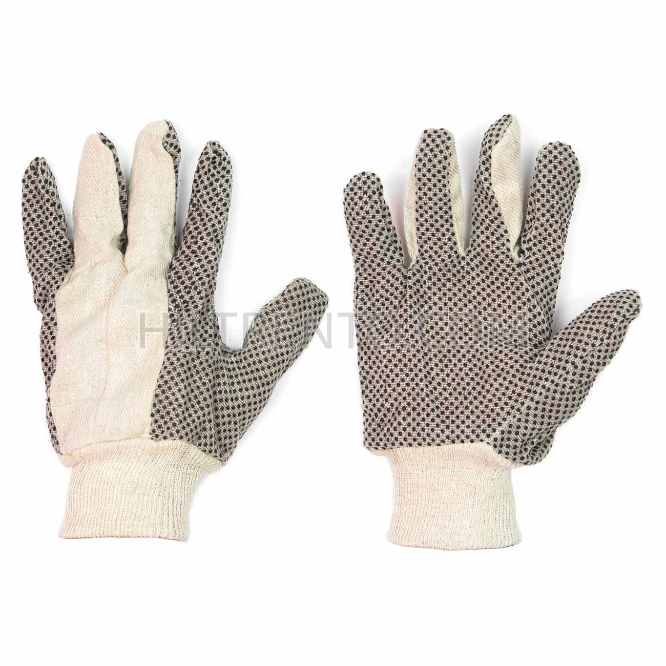 Guantes de lona de algodón con puntos antideslizantes en la palma y dedos. Para trabajos de manipulación general. Los puntos de pvc añaden adherencia y resistencia a la abrasión. Es transpirable y repele el sudor. Puntos negros y lona color crema/beige. Muñequeras ajustadas.